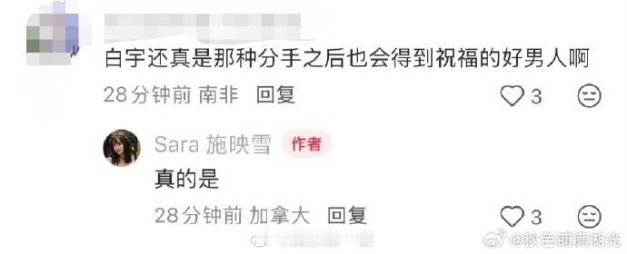 白宇 分手后也会得到祝福的好男人白宇 分手后也会被祝福的好男人 近日,疑似白宇前女友发声,谈和明星谈恋爱是种什么体验,配图是自己依偎在白宇肩头的合照。网友:“白宇还真是那种分手之后也会得到祝福的好男人啊”,她回复:“真的是。”