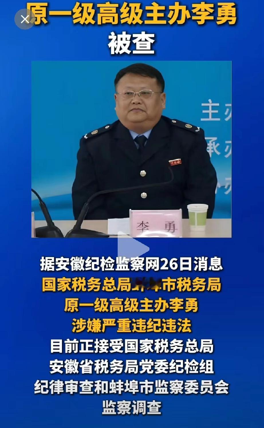 年后开工的第3天,税务部门反腐又再下一城。 国家税务总局蚌埠市税务局原一级高级主办李勇,今天彻底栽了。 这个李勇不简单,他1963年11月出生于安徽怀远,拥有大学本科学历,从1982年12月开始参加工作。 参加工作以后,便一直在蚌埠市的税务部门工作,曾经担任过安徽省蚌埠市税务局东区分局办事员,一步一步成长为蚌埠市税务局办公室科员,税政一科科员,此后还担任过安徽省蚌埠市国家税务局涉外分局(科)局长(科长),流转税科科长,第一税务分局副局长、局长。 之后晋升为安徽省蚌埠高新技术产业开发区国家税务局局长,安徽省蚌埠市国家税务局总经济师,蚌埠市国家税务局党组成员、副局长。 此外,还担任过国家税务总局蚌埠市税务局联合党委委员、副局长。国家税务总局蚌埠市税务局党委委员、副局长。 最后的落脚点是担任国家税务总局蚌埠市税务局一级高级主办。 纵观他的履历,绝对算得上税务部门的老人,参加工作的30余年里,一直深耕于税务部门,而且在核心岗位担任副职。 从官网发布的照片来看,李勇,身穿税务部门的制服,脑袋比较大,脖子比较粗,身材也是比较臃肿,戴着一副眼镜,看起来肥头大耳。 1963年11月出生的他,按道理说应该已经退休两年了。 估计他自己也没有想到,在退休两年之后,会有落马的一天。 税务部门,近些年来已经成为腐败的高发地之一,一方面是由于税务管理的漏洞,制度不完善,监管不到位。另一方面则是从业者法律意识淡薄,心存侥幸心理,认为自己的贪污行为难以被发现。 这起案例,也再次给税务部门的从业人员提了一个醒,既然选择了这份工作,就必须恪守本心,严于律己,廉洁从政,要不然,吃了多少,最终都得吐出来。