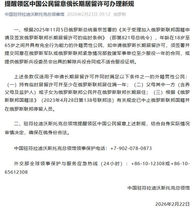 普京给长期居留“加码”,中国男性要当心,一不小心可能成“壮丁” 最近,很多在俄罗斯生活的中国朋友,特别是男性,都开始在手机和微信群里传阅一则来自中国驻符拉迪沃斯托克总领馆的提醒。 这条消息,直接掀开了那些快要取得“长期居留”资格的人内心的担忧。 今年普京的那项新决策,为外国男性申请长期居留设了一道新门槛。 年龄在十八到六十五岁之间的外籍男性,如果希望在俄罗斯长期生活,现在多了一项特殊要求,要服役,想要有绿卡,除非证明自己无法服兵役,否则得签下一份在部队或紧急部门工作的合同,而且最短都要待上一年。 那谁是最容易遇到麻烦的一群人?这次政策似乎主要盯着三种类型的人。 第一类是那种已经有了部分居留身份,在俄罗斯一年多的,想要“身份升级”的“老油条”。 第二种是和俄罗斯公民有直系血缘关系的群体,生活基础已经扎了一半。 第三类则属于那些曾经有俄罗斯身份、后来又舍不得完全离开的。 简而言之,只要你盼望长期落地生根,赶上新政策,下一步就得考虑如何规避“服役”对生活的影响。 只要关注俄乌冲突的新闻都发现,俄方补充人手的需求很明显。 集团强行拉高外籍人服役门槛,其实是为了让队伍更“有人”。 去年普京允许外国人参军已经是个信号,这次等于用身份再推一把。 俄罗斯人想要解决自己的问题,但办法却落在外籍身份申请人的身上,挺巧妙也挺现实。 以往大家觉得长期居留是趋利避害的选择,现在变成了得掂量个人意愿和风险的挑战,大家恐怕都得多备选项多打算盘。 社交网络上流传诸如警方排查身份、集中查男性体检、各类小道消息层出不穷,虽然不少官方已经辟谣说并非专门针对外籍劳动力,也没专门组织什么“壮丁队”,可事实是,政策一出,所有在当地谋生的中国男性都打醒了十二分精神。 他们不再是对身份政策毫无所知,也不再认为自己就是政策外面那一群安全的人。 原本想留在俄罗斯发展的年轻人,现在必须先解决兵役难题,自己未来到底要不要参与军队、会不会被点名,都成了现实考题。 有人问,这种兵役政策为什么挑外籍人下手?俄罗斯本土人口老龄化,军事压力日渐加大,想要用激励办法“吸收”新血,这其实只是一块“借力打力”的妙招。 大家原本看重的优待政策现在成了筛查男性人力资源的窗口。 很多中国男性在俄罗斯有自己的生活圈,突然多出一道审批关口,所有入籍梦想都要多问一句:自己能不能“豁免”,是不是安全范围里的那个人? 政策背后的门道在于,俄罗斯目前用身份政策“变相”筛选可用男丁。 很多规则都规避不掉外籍男性参与兵役的可能。新政偏向于让申请人既能补充军队,又能分流部分社会压力。 就算对政策不关心,在俄的每个人也应该明白,这已经不是简单的文件升级,而是生活轨迹的巨大分叉。 有的人选择继续留在俄罗斯,是看中这里的机会和平台。现在新政一出,除了考察个人实力、学历和经济能力,更要求衡量自己面对未知的勇气。 准入门槛提高后,大家都体会到,凡事该找专业人士把关,遇到无法判断的问题时赶紧和中国使领馆联系,别被突如其来的变化砸到自己身上才后悔莫及。 面对不确定的身份政策,无论走到哪里,还是要把安全、健康摆在第一位。 每次新规调整,都要看清自己现在的处境、分析可能的下一步风险,不急于下结论,也不草率做选择。 在外生活难免遇到新变动,只要知道选择权握在自己手里,懂得随时把握最新消息,并依靠正当合规的办法应对,不轻信流言、不冒险触碰底线,上面这类政策再复杂,也难困住一个谨慎且明智的中国人。 信息来源:中领馆提醒:18-65岁在俄长期居留男性,须同意在俄军事单位等至少服役1年——2026-02-26 12:57·中国青年报
