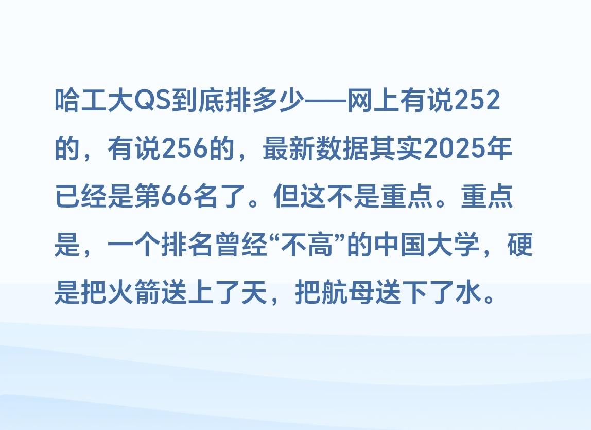 去年有个澳洲留学生,在网上发文嘲讽哈尔滨工业大学:“你一个全球排名252名的破大学,拿什么跟我全球排名第19名的学校比?拿命比吗?” 哈工大QS到底排多少? 网上有说252的,有说256的,最新数据其实2025年已经是第66名了。 但这不是重点。 重点是,一个排名曾经“不高”的中国大学,硬是把火箭送上了天,把航母送下了水。