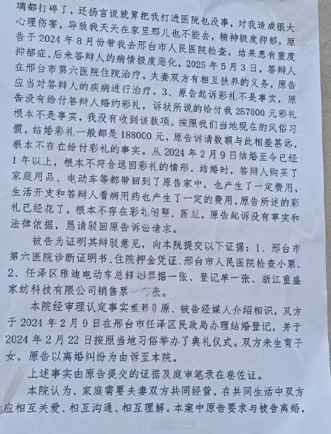 女子婚后拒同房法院判定不予离婚 这个法院的民事判决书里,女方称经常受到家暴,受到男方的威胁恐吓,那为啥转过头又说,两人感情很好,没有破裂~坚决反对离婚这不是前后矛盾吗?既然感情很好,女方称所谓常被家暴,总不会自愿求揍后感觉找到了快感吧一边说常受家暴受虐待,一边又说夫妻感情好反对离婚。那只有一个解释,拖时间~!婚姻延续时间超过1年以上,几十万彩礼就成了纯利润了