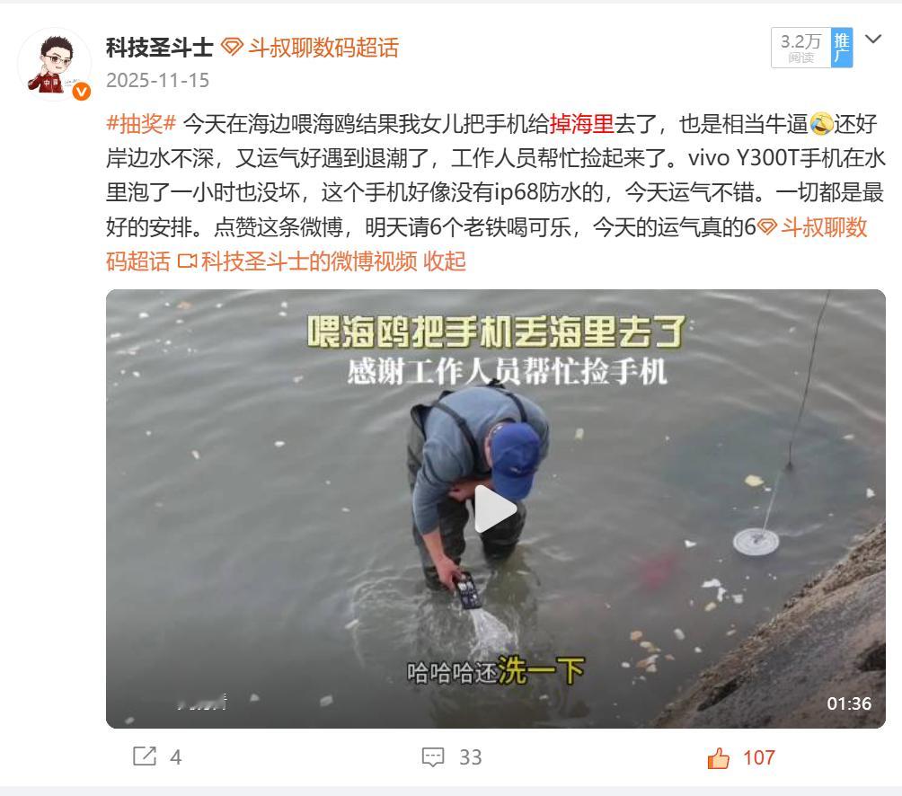 手机落水花千元打捞13小时还能用 这个华为手机上万元,打捞费1100元,手机没有坏,找回来还是很值得的。我之前我女儿的vivo Y300T也掉海里了,打捞费也要1000元,我没舍得,因为那个手机才1000多元哈哈,我打算自己下去检,公园的工作人员不让我下去,等退潮了他们派人帮我捡起来了。那个手机当时泡了差不多1个小时吧,也没坏,现在我女儿还在用这。