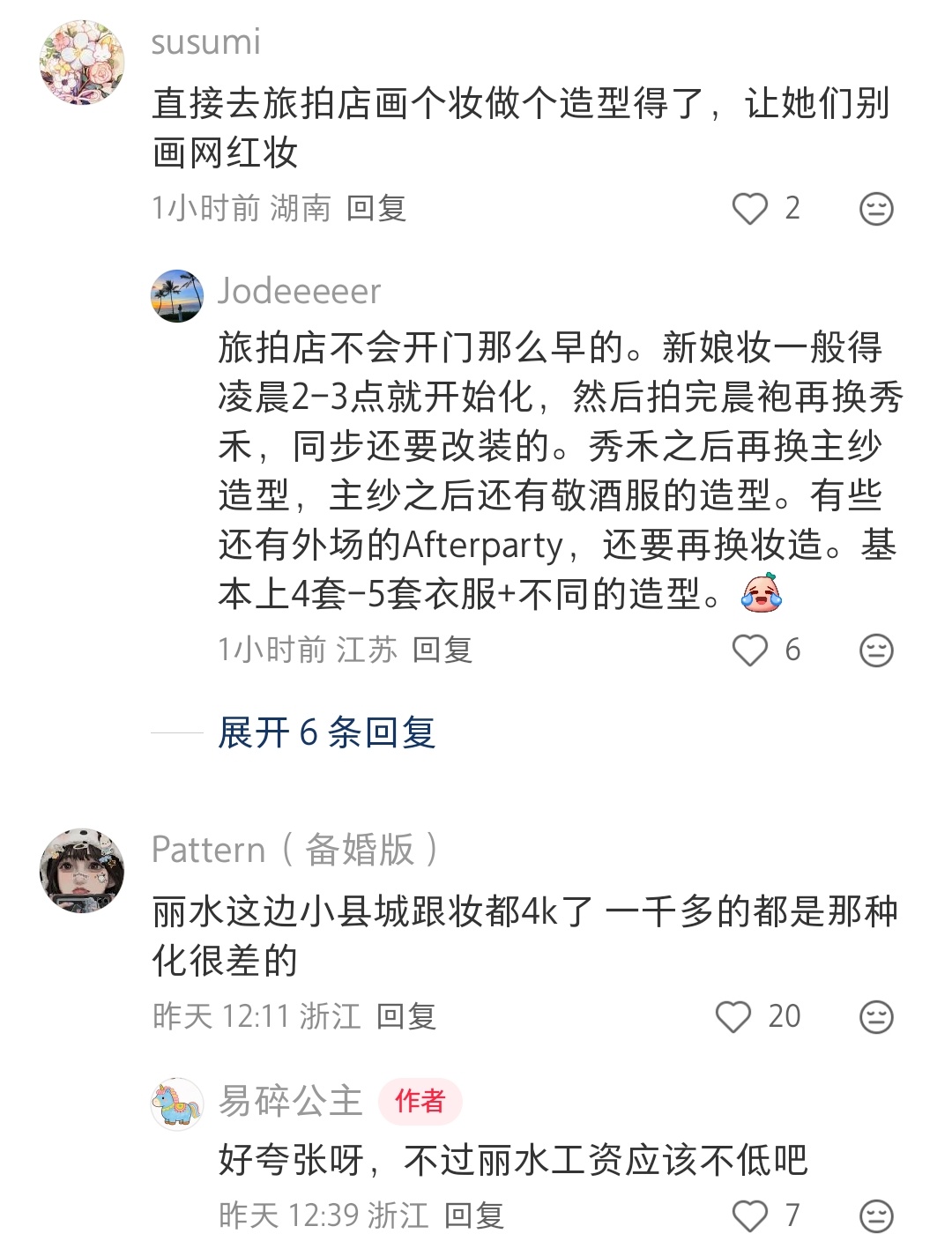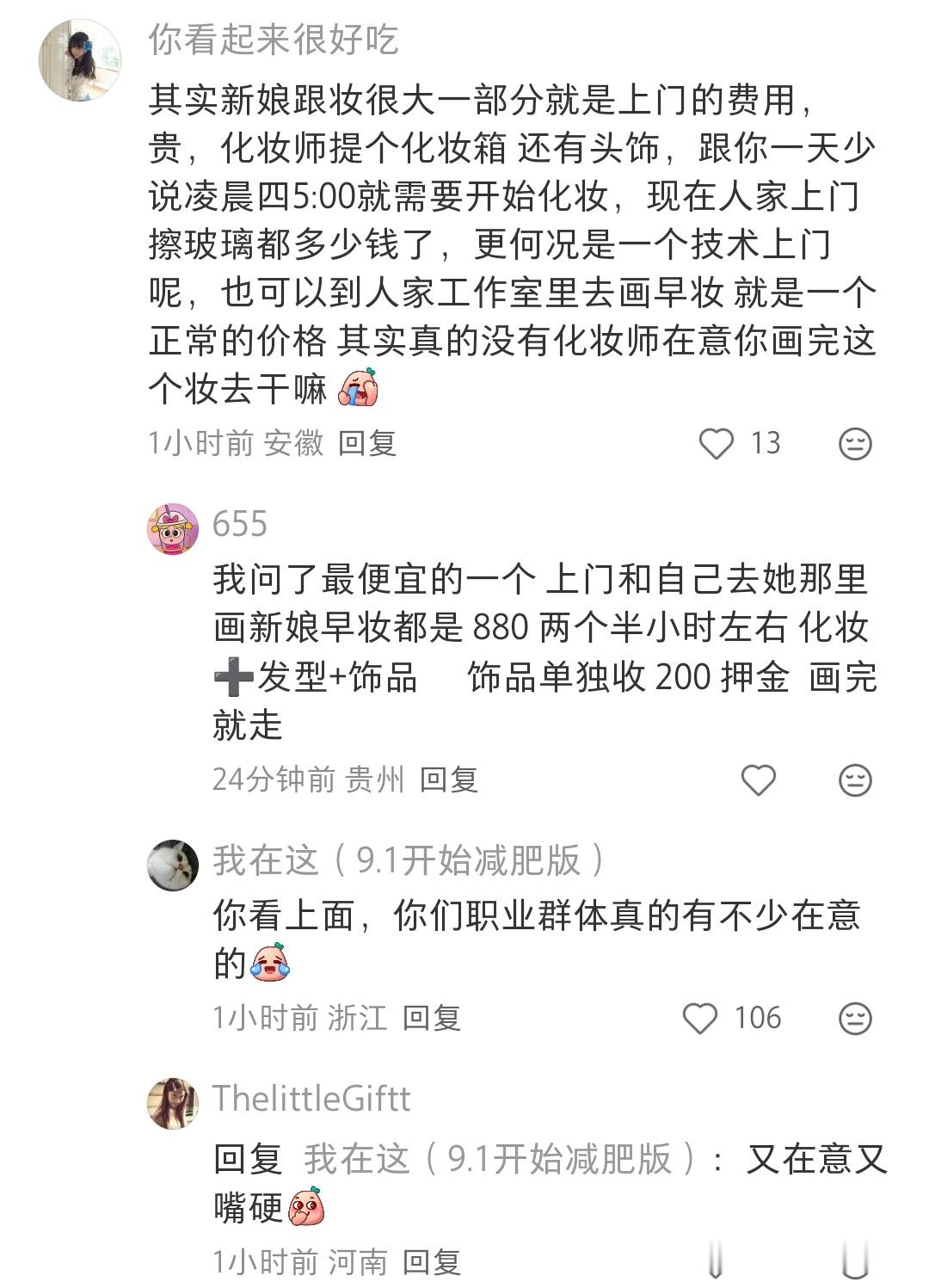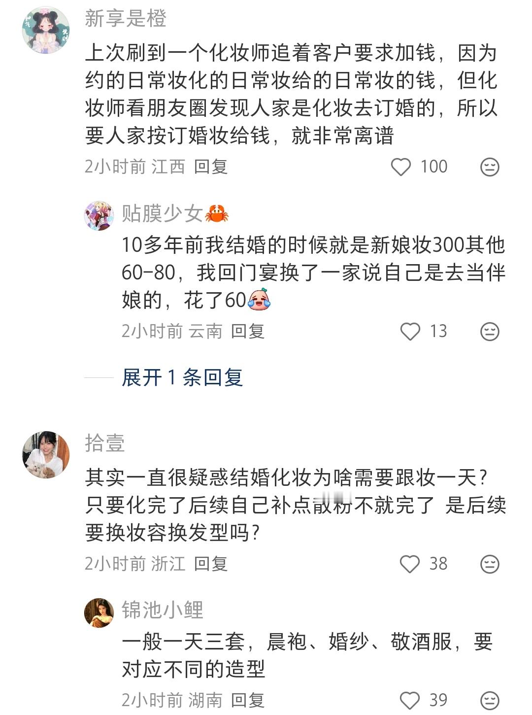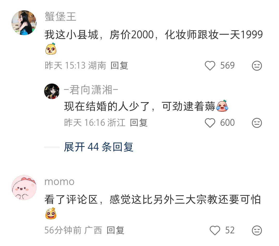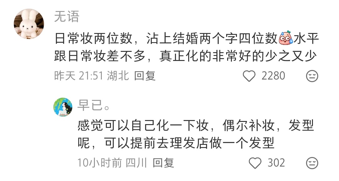 莫天 2 2026-02-28 00:59 小地方这么贵的非常不值,建议自己化,不然你找到的技术不行又花钱又糟心,造型可以采纳刘亦菲很火那个满天星造型搭配婚纱,秀禾头饰自己网上找教程,让自己闺蜜搭把手弄一下,很简单的保证不掉就行,不想买假发包和装饰之类的可以网上提前租,服装不想去婚纱店的也可以网上提前租,敬酒服就刘亦菲那个满天星造型,只不过满天星换成颜色跟你衣服搭一点的花也很好看,想出片就花点钱找有技术的摄影,想简单记录的就提前安排好哪几个人每个人主要拍什么方位,录什么视角,需要架机位的提前准备好支架,这些人亲朋好友总能做的吧,事后给个红包,如果有钱以上忽略