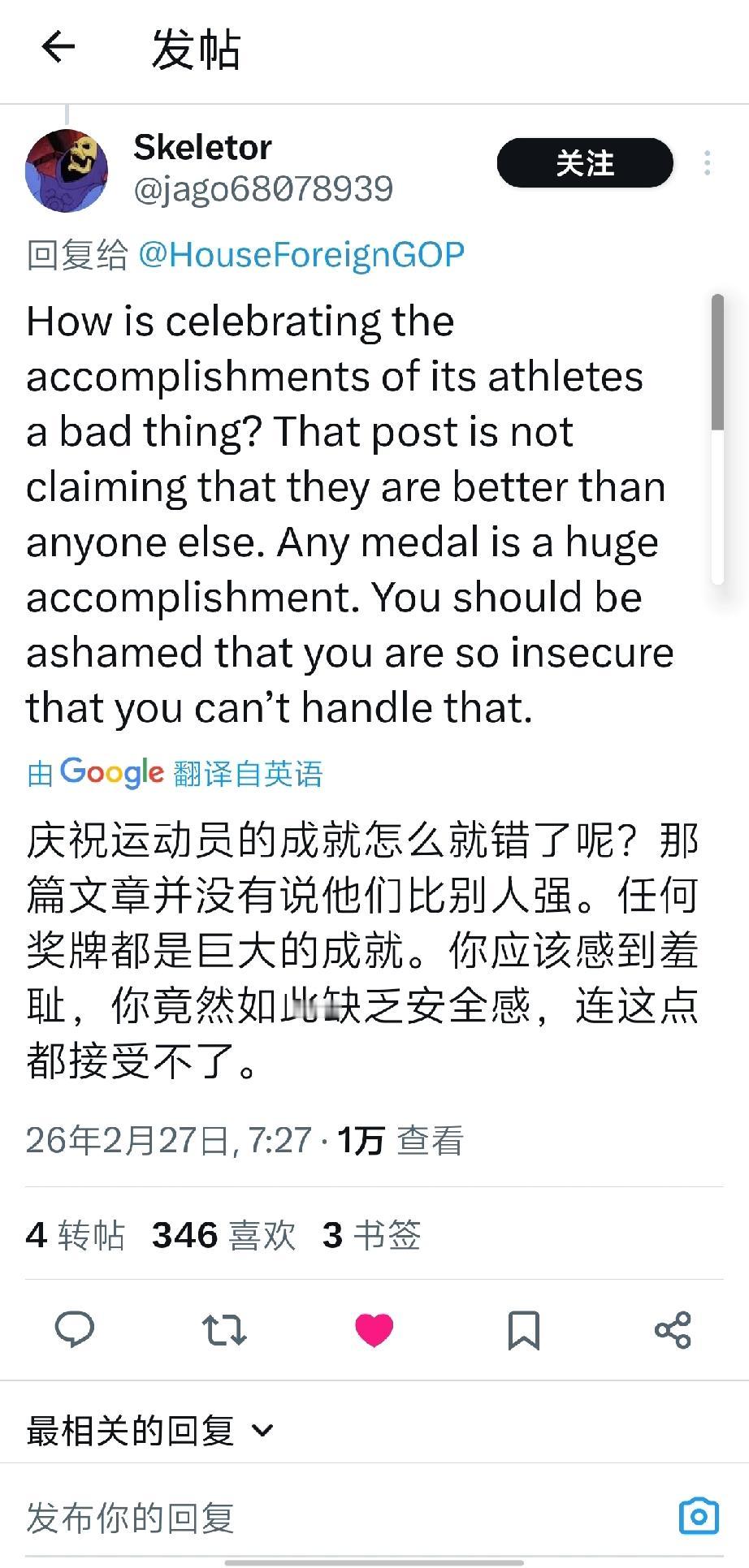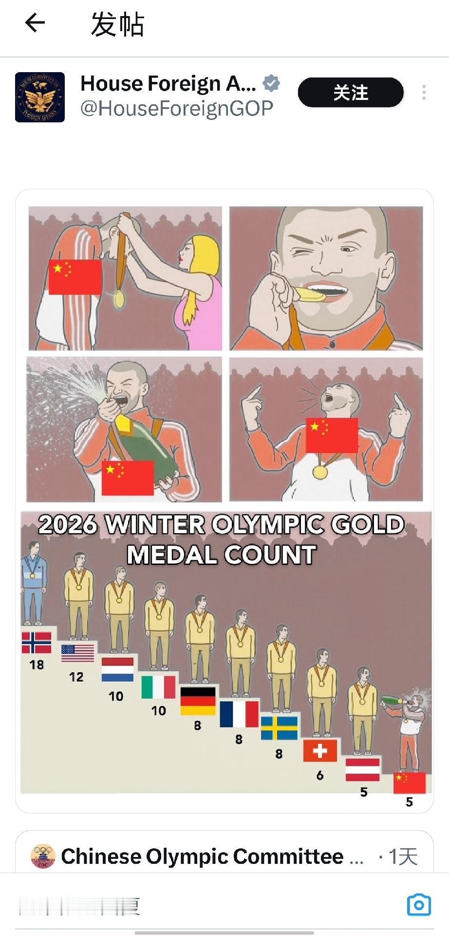 美国官方到底有多草台班子、low到什么程度?这次真的让我又一次大开眼界。中国奥委会发布了一张冬奥会我代表团奖牌运动员的海报,然后被美国众议院外交委员会的官方账号转发,并制作梗图嘲讽。别说我们或其他国家网友,美国人自己都对此感到震惊和羞耻。。。