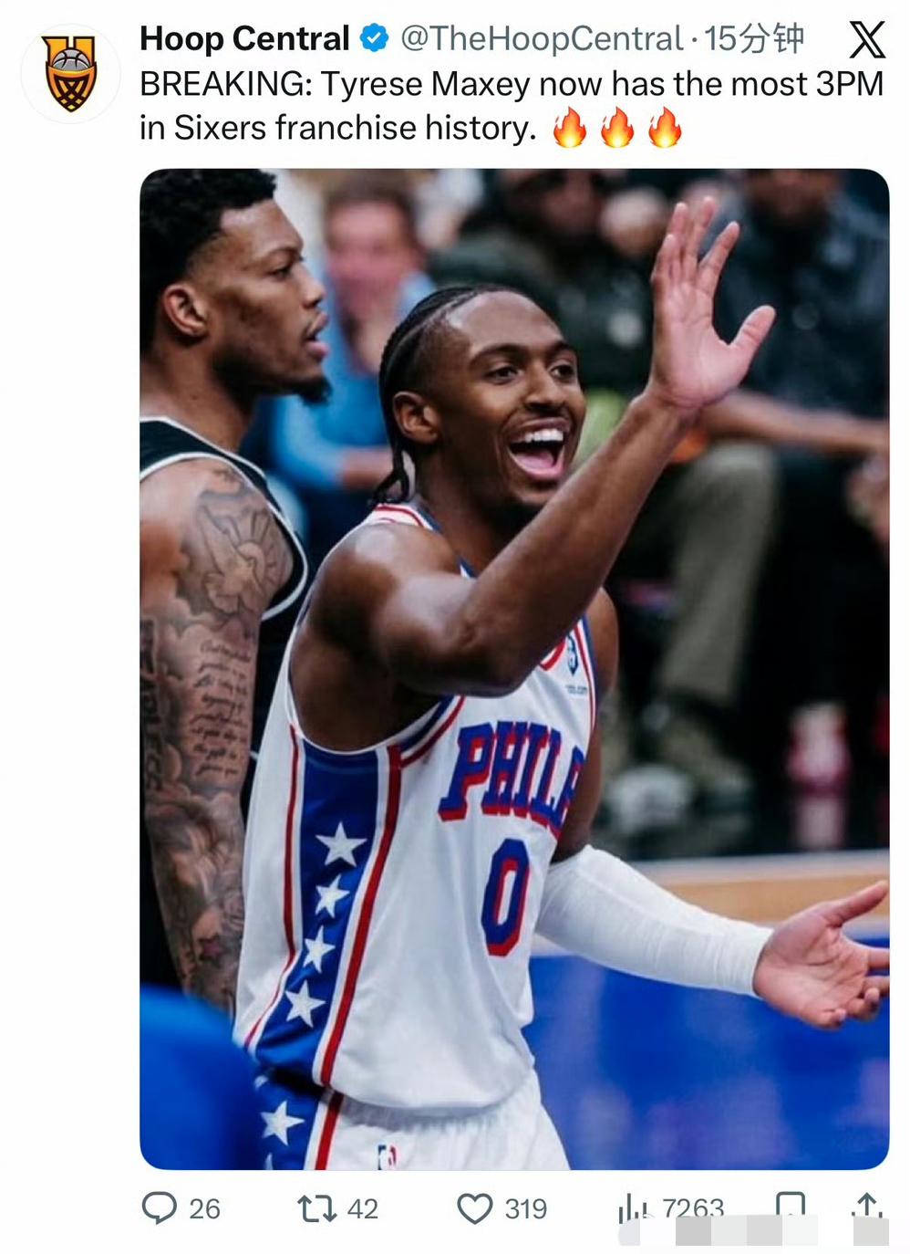 🔥 里程碑:马克西加冕76人队史三分王 2026-02-27 76人vs热火,马克西首节命中第886记三分,正式超越艾弗森(885记),成为队史新三分王。 马克西25岁,现役最年轻的队史三分王之一,未来纪录还会大幅刷新。 艾弗森:722场,885记,生涯三分命中率31.3% 马克西:约400场,886记,生涯三分命中率39%+,效率更高 标志76人后场从艾弗森时代,正式过渡到马克西时代。 他是球队绝对核心,本赛季场均33+分、三分命中率42%+,MVP热门。