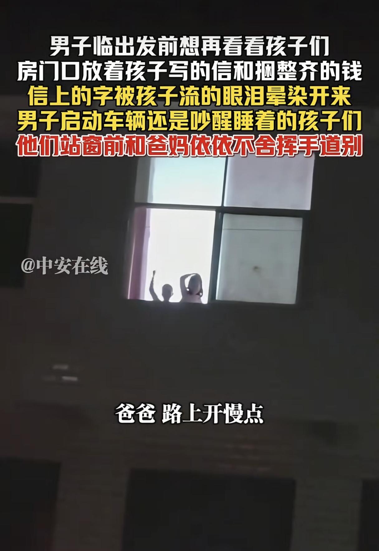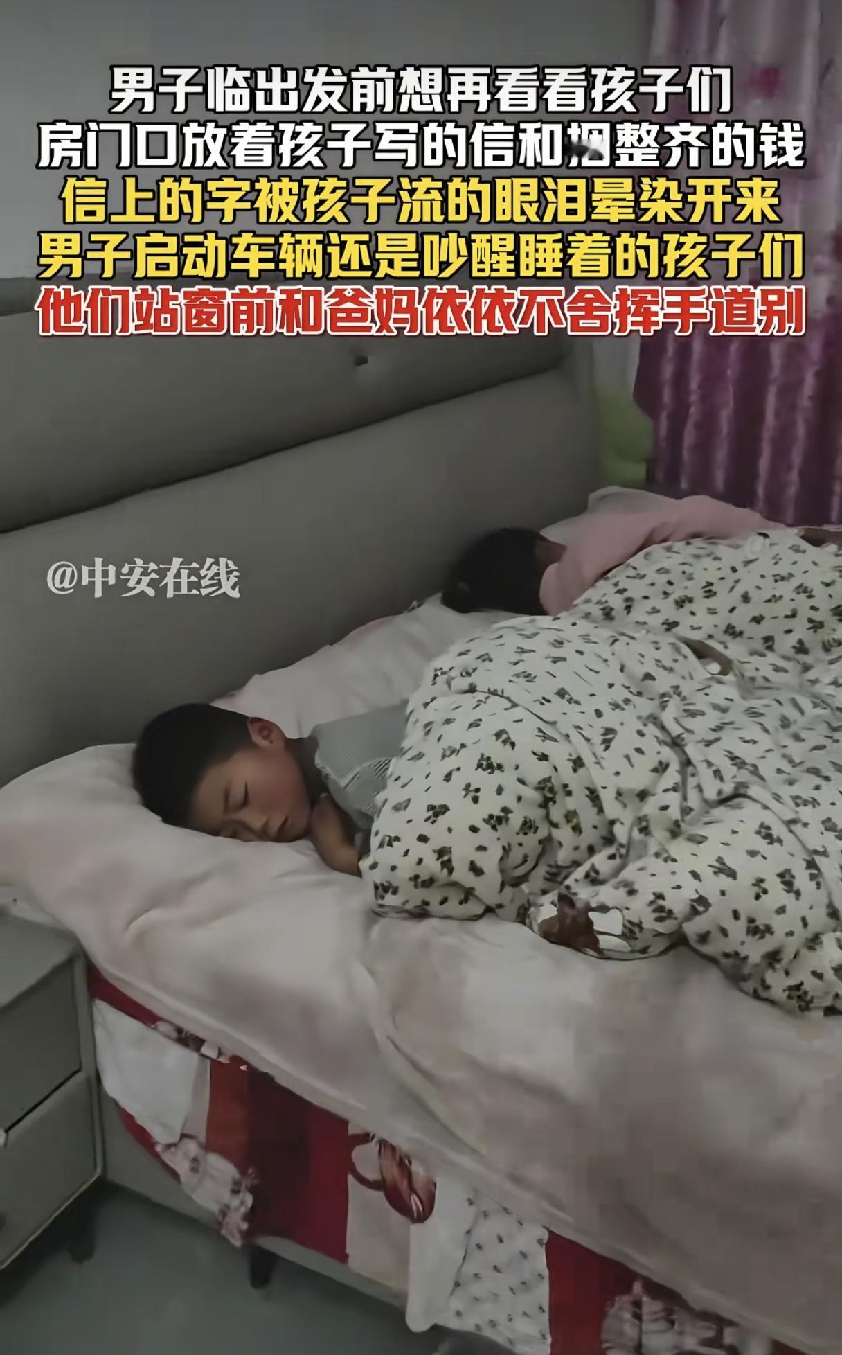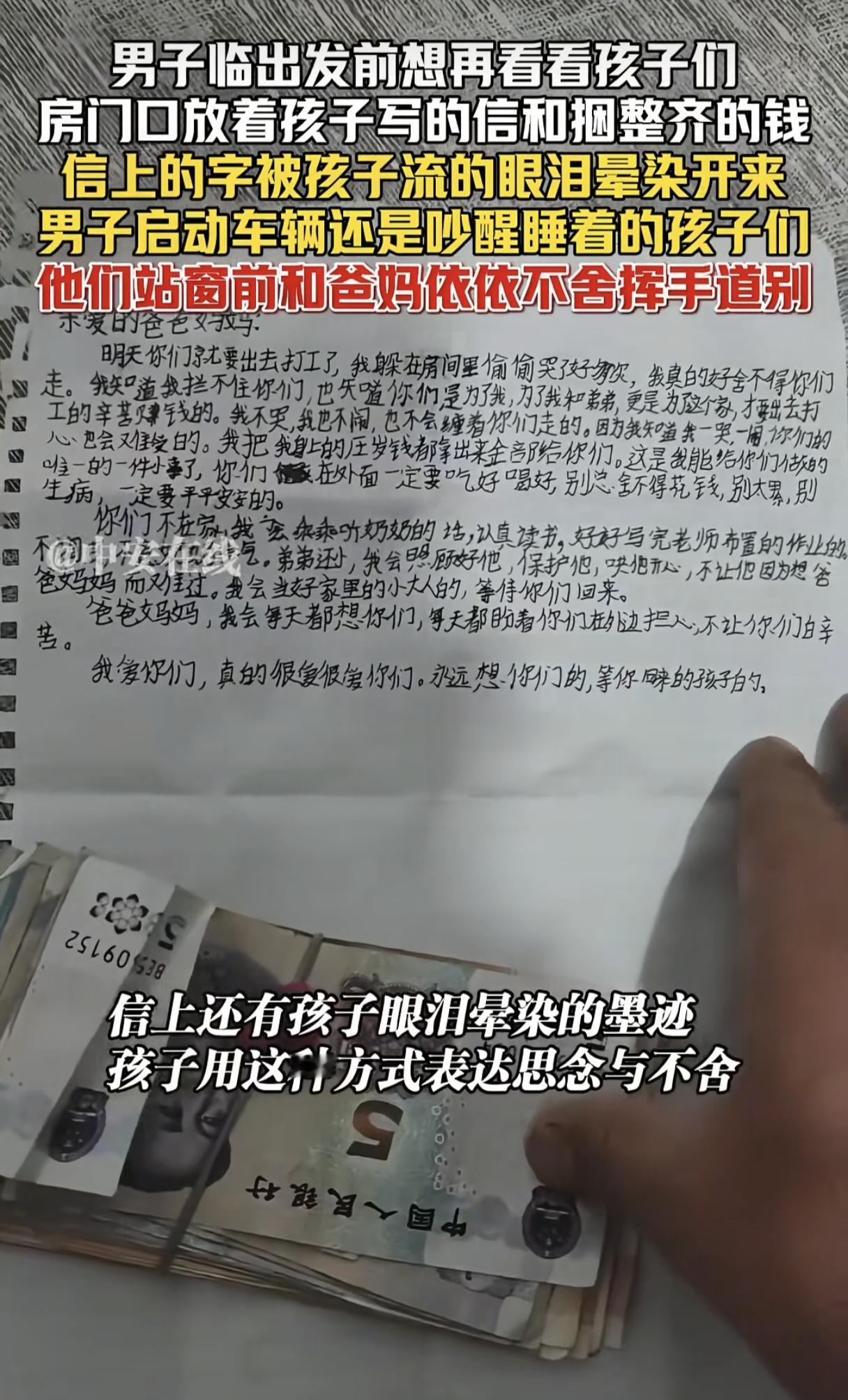 看哭了!江苏男子临出门时想再看看孩子,却发现门口有封孩子写的信和捆绑整齐的钱,信上写:“我知道我拦不住你们,我不哭,我也不闹,因为我知道我一哭一闹,你们的心也会难受的。” 信上还有孩子眼泪晕染过的痕迹,孩子写信的过程一定是充满了不舍,哭了又哭! 男子不舍的推开门想再看看熟睡的孩子,给孩子盖了盖被子,再见面又不知是多久了! 男子本想趁着天黑悄悄离开,但车子启动的声音还是惊醒了孩子,就在夫妻俩准备离开的一瞬间,姐弟俩站在楼上冲着爸妈喊:“爸爸路上开慢点,注意安全!” 俩孩子真的没哭没闹,懂事的让人心疼,父母纵有万般不舍,但为了生活,不得不离开家乡,家家有本难念的经! 信是女孩写的,语言简单却让人感动泪下,她说:“我把我身上的压岁钱都拿出来给你们,这是我能给你们做的唯一一件小事了。” 女孩还叮嘱爸妈在外别舍不得吃穿,说自己会照顾好弟弟,会听奶奶的话…… 看着女孩也就八九岁的样子,说的话却俨然一副小大人的口气,钱零零碎碎却捆的整整齐齐,那是她认为最好的东西了,她想把自己最好东西的给爸妈带走! 有没有可能孩子根本没睡着,在爸爸进房门之前还在流泪…… 普通人活的不容易,有工作的地方没有家,有家的地方没工作!不能陪孩子长大,不能给父母养老…… 只能珍惜当下,有空常回家看看吧!