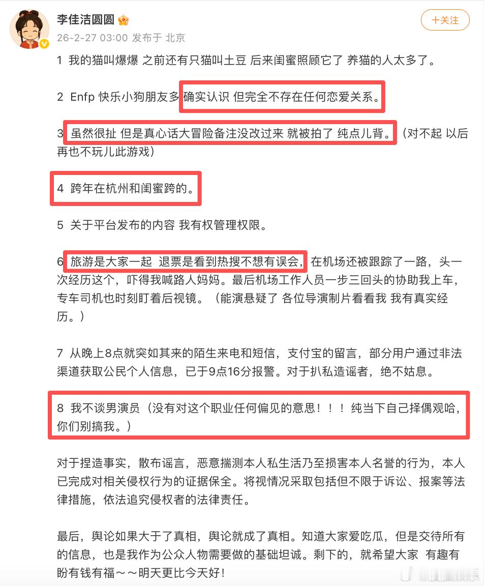 曝程相李佳洁恋情今日凌晨,李佳洁发长文否认与程相恋情,表示“确实认识,但完全不存在任何恋爱关系”,备注是真心话大冒险改的,跨年是在杭州和闺蜜跨的,旅游是大家一起的,还坦白自己的择偶观是“不谈男演员”。此前,程相工作室也曾发文否认谣言。