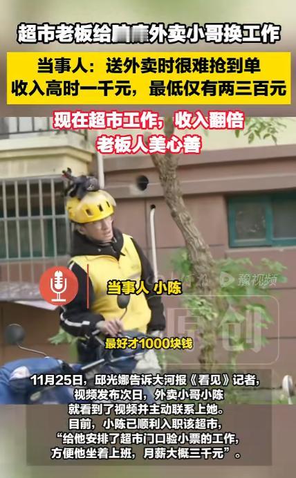 2025年,江苏宿迁超市一老板,由于一时疏忽让一外卖员在店内白白等了很久,她感到十分愧疚,果断发布寻人启事,寻找这位残疾外卖小哥,哪料见面后才发现,这位19岁小伙因脑瘫求职屡屡碰壁,月收入曾低至两三百元,没想到邱光娜的一个决定,不仅让他重获工作,还意外点燃了更多希望。 2025 年 11 月的江苏宿迁,市区里一家生意红火的超市每天人来人往,超市老板邱光娜守着这份热闹,每天打理货品、对接订单、接待顾客,日子过得忙碌又踏实。 谁也没想到,一次再平常不过的小疏忽,会牵出一场温暖全城的寻人,更悄悄改写了一位年轻外卖员的人生。 邱光娜的超市里最近开发了线上熟食的生意,窗口上线之后,购买的人是络绎不绝,一个又一个外卖小哥都涌入她的店内取餐。 某天中午店内非常的繁忙,邱光娜看监控的时候,却发现了一个不一样的外卖小哥,她一眼就看出小伙身体有着明显不便。 因为店内的员工繁忙,小伙应该是第一次来超市取餐,联系不上人、找不到取餐口,只能白白耗着宝贵的时间。 对于争分夺秒的外卖员来说,每一分钟都关系着收入和口碑,想到自己的疏忽让本就行动艰难的人空等许久,邱光娜又自责又心疼。 她翻遍订单记录,也没能找到小伙的联系方式,这份愧疚在心里越积越重,她打定主意,一定要找到这位外卖小哥。 邱光娜拿起手机拍了一段朴实的视频,并发布到了社交平台上,希望能够借助互联网的力量找到这个外卖小哥。 视频发出后很快火了,宿迁本地的网友纷纷转发扩散,留言区挤满热心线索,一场由普通人发起的寻人,变成了整座城市的温柔接力,大家都想帮这位心软的老板,找到那位默默努力的年轻人。 功夫不负有心人,11 月 25 日邱光娜就传来了好消息,视频发布的第二天,这位名叫小陈的外卖小哥就刷到了寻人视频,主动和她取得了联系。 见面详聊之后邱光娜才知道,这个小陈患有脑瘫,身体的不便伴随他整个成长过程,手指不灵活,连握手机、点屏幕都要比别人慢好几拍,想要在外卖平台抢单,对他来说更是难如登天。 别人眨眼就能完成的操作,他要反复尝试,大多数时候订单刚弹出就被抢走,能接到的单子少得可怜。 动作迟缓也让他在送餐路上举步维艰,赶时间、怕超时是每天都要面对的压力,偶尔没能按时送达,还会收到差评,收入自然没有任何保障。 因为身体原因,他碰过无数次壁,很多岗位看到他的情况,都委婉拒绝,送外卖是他好不容易争取到的工作。 即便这份工作格外辛苦,他也咬牙坚持,可收入始终少得可怜,状态好的时候一个月能挣一千元,遇上单子稀少的月份,收入直接跌到两三百元,连最基本的日常开销都难以维持。 了解到小陈的遭遇,邱光娜没有停留在口头安慰,而是立刻做出了温暖又务实的决定,她要给小陈在超市里安排一份适合他的工作。 她仔细考量小陈的身体状况,避开需要奔波、抢时间的岗位,特意选定超市门口检验小票的工作,这份工作不用来回走动,不用和时间赛跑,只需要坐着就能完成,轻松又稳定,完全贴合小陈的实际情况。 薪资上,她给小陈定下三千元的月薪,这个数字比他之前送外卖的最高收入翻了两倍,比最低收入更是高出十倍不止,直接解决了小陈最核心的生活难题。 小陈顺利入职那天,脸上带着腼腆又开心的笑容,之前送外卖时的疲惫和局促少了很多。 换上干净的工作服,坐在超市门口的岗位上,他格外认真,仔细核对每一张顾客的小票,遇到疑问时轻声询问,态度温和又专注。 不用再担心抢不到单,不用再害怕送餐超时,不用再为微薄的收入发愁,稳定的工作和踏实的收入,让这个年轻小伙重新找回生活的底气,眼神里多了几分从容和安心。 邱光娜也格外照顾小陈,把他当成店里的家人,耐心教他工作流程,身边的同事和常来的顾客,也都对这个努力的小伙格外友善,小小的超市里,处处透着温柔的氛围。 邱光娜的这份善意,没有华丽的包装,没有刻意的宣扬,只是源于一次愧疚,一份对努力生活的人的心疼与尊重。 她用一个实实在在的岗位,为小陈撑起了一片安稳的小天地,让这位身残志坚的年轻人,能够靠自己的劳动获得体面的生活。 这份温暖没有终点,它在城市里悄悄传递,提醒着每一个人,善意就藏在举手投足之间,一次伸手、一份体谅,就能照亮别人前行的路,让平凡的生活,满是温柔与光亮。 对于这件事,您有什么想说的吗?欢迎评论区留言讨论。 信源:豫视频2025-11-26——《超市老板给脑瘫外卖小哥换工作,当事人:比送外卖时收入翻倍》