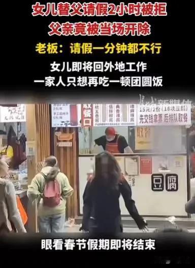 “周扒皮现世!”女子的父亲,在小吃店工作,凌晨1点才能下班,过年一家人都难以团聚,她想和父亲吃个团圆饭,就帮父亲请两个小时假,不料老板扬言道,请一分钟都不行,还当场开除她父亲,并且一分钱不补偿,女子终于忍不住了,冲到小吃店闹起来。 春节假期就要结束了,女子回家之后,和父亲相处的时间,寥寥无几,她就要启程了,这一别可能又得一年,才能回来看父亲。 可父亲在那家绝情臭豆腐小吃店工作,平时都要工作到凌晨1点才能下班,他忙得团团转,过年一家人就吃了一次团圆饭,后面就难以在团聚了。 如今春节假期就要结束了,女子就想和父亲再吃一次团圆饭,好好告个别,她要继续启航奋斗了,她看着父亲那么辛苦的工作,也想着自己多努力一点,分担父亲的压力。 她决定,离家之前,她要和父亲好好吃个团圆饭,她打电话给父亲的老板,她只是尝试和这个老板沟通,希望老板能够给她父亲两个小时的假。 女子很清楚,过年期间,小吃店生意肯定是很好的,老板也缺人,她不能在小店生意最好的时候,给父亲请假,她选择了在23点之后,请最后两个小时的假,这个时间段,客人比较少。 即使这样,女子还是考虑得很周到,可能这两个小时,老板也会很不乐意,老板有可能因为缺了一个人手,会有损失,因此表示她可以承担这些损失,老板也可以扣她父亲的工资,她自己会给父亲补上这两个小时的工资。 她以为,只要自己不让老板有任何损失,老板就会批这两个小时的假。 却没想到,电话打通了,女子说出了自己的请求,也说出了自己的理由,老板态度却非常坚定地说了一句:“请一分钟都不可以!” 听到老板那语气,女子听着就一肚子气,父亲遇到这样的老板,她真的替父亲感到心疼,这个老板说话实在气人。 就两个小时的假,即使他过年缺人忙,也就两个小时而已,更何况她愿意承担这两个小时的损失,就这样,老板都不近人情,她真的替父亲担忧,更是心疼父亲。 遇到这样的老板,根本不会换位思考,根本不考虑,员工还有家庭。 平时他要求员工,工作到凌晨1点下班,这么高强度的工作,这么辛苦的工作,女子想想这些,就提父亲担忧。 现在她不过是想让父亲请两个小时的假,这两个小时不会对小吃店造成什么损失,即使造成损失女子也愿意全部承担,有这样的条件,老板都不同意,她可以想象,父亲在这里工作有多么的憋屈。 不单单是这一次请假的事情,据女子所知,她的父亲在这里工作,老板会经常用言语辱骂她的父亲, 如此侮辱可不止一次了。 父亲在这样的小吃店工作,女子再也忍不下去了,本来她其实也想好了,就只请两个小时的假,实在不批假,那就不请假了,等父亲下班之后再吃团圆饭也行。 看到这个老板如此态度,女子终于忍不住,她过去小吃店,要给父亲讨个公道。 结果她来到小吃店,她看到父亲被当场辞退了,并且一分钱补偿都没有。 看到这样的情景,看到父亲委屈的样子,女子愤怒了,于是就在小吃店闹了起来。 这样的老板实在是太过分了,就两个小时的假,他不但不批,还要辞退员工,甚至还在威胁女子的父亲,女子决定,让更多的人知道她的父亲有这样的老板。 消息发出去,很快这个老板被舆论覆盖了,他这才松口,愿意补偿一个月的工资。 遇到这样的老板,确实令人意难平。 只是请两个小时的假,老板可以不批,不能辞退员工,这是违法辞退。 《劳动合同法》第87条规定;用人单位违法解除劳动合同的赔偿标准为经济补偿标准的二倍;经济补偿计算方式为劳动者每满一年工作年限支付一个月工资,六个月以上不满一年按一年计算,不满六个月支付半个月工资;具体赔偿金额需结合实际情况确定。 只要是违法辞退,老板就要承担相应的责任,进行相应金额的赔偿。 那么你对这样的老板有何看法呢?