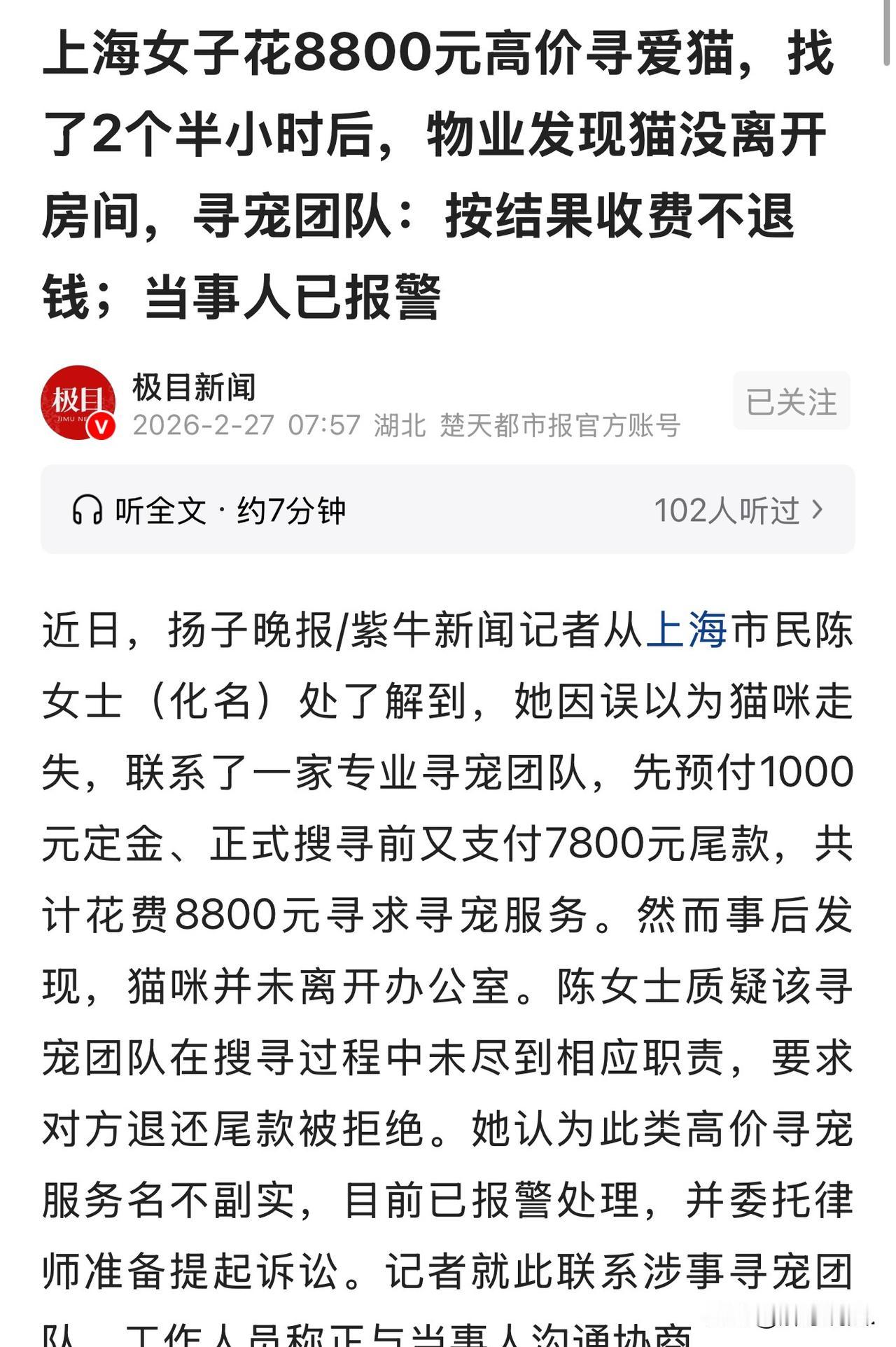 “白嫖吗?”上海,女子将自己的宠物猫带到朋友办公室玩耍,谁知,不一会的功夫猫不见了。女子见窗户开着,怀疑猫是从窗户跳出去了,寻找无果后,女子找来寻宠团队帮忙找猫,先支付给对方1000元定金,寻猫正式开始以后,又支付尾款7800元,共计8800元。可寻宠团队找了2个半小时后,也未找到猫,结果,物业发现猫根本没离开房间。女子认为既然猫是物业找回来的,不是寻宠团队找回来了,就不应该全额收取8800元费用,要求寻宠团队退还7800元的尾款,对方果断拒绝,称:按结果收费不退钱。女子一气之下报了警。 2月21日晚上,陈女士带着自家猫咪到朋友的办公室玩耍。一转眼,猫咪却不见了踪影。 她一眼瞥见窗户敞开着,心瞬间提到了嗓子眼,第一反应就是:猫肯定跳窗跑丢了! 一想到猫咪可能在外面挨饿受冻、害怕无助,陈女士就坐立难安。 从晚上7点多一直找到凌晨1点,她在办公楼附近一遍又一遍地喊、一遍又一遍地找,嗓子哑了,腿也跑酸了,可猫咪就像人间蒸发一样,半点踪迹都没有。 漆黑的夜里,她越找越崩溃,又自责又心疼,一整晚都没合眼,满脑子都是猫咪的样子。 第二天早上6点多,一夜未眠的陈女士几乎是绝望地刷着手机,突然在小红书上刷到了专业寻宠团队,像是抓住了最后一根救命稻草,她几乎是手抖着联系上对方。 加上微信后,对方立刻甩出多款寻宠套餐,价格从8800元到48000元不等。 救猫心切的陈女士根本顾不上犹豫,直接选了最基础的8800元“单犬双人”套餐。对方迅速拟好合同,陈女士先转了1000元定金,可工作人员迟迟不动身,非要她先把7800元尾款一次性付清才肯出发。 一心只想快点找回猫的陈女士,想都没想就把全款转了过去。 上午8点,寻宠团队带着搜寻犬正式开始搜寻。陈女士守在一旁,满心期待能有好消息。 可谁能想到,两个多小时过去,寻宠团队一无所获,反而是物业工作人员在办公室桌子底下,听到了猫咪挠门的声音。 打开一看,猫咪安安全全待在里面,自始至终就没出过门。 这一刻,陈女士又庆幸又憋屈,一股火直接涌上心头。 她立刻跟对方沟通:猫不是你们找到的,我也不亏待你们,1000元定金就当辛苦费,剩下的7800元尾款退给我就行。 可对方态度强硬,直接拒绝,还理直气壮地说他们是“按结果收费”,只要猫找到了,就必须收全款。 等到陈女士再想联系对方理论,客服干脆电话不接、信息不回。 原本是焦急找猫,最后反倒被狠狠坑了一把,陈女士又气又委屈,当场选择报警。 目前她已经按照警方建议,在支付平台举报并申请冻结款项,同时委托律师收集证据,准备起诉这家寻宠团队,为自己讨个公道。 此事曝光后,网友给出不同看法: 这个猫是物业找到的,不是寻宠团队找到的,而且他们也没有在猫躲藏的办公室寻找,可以说对于找到猫没有发挥任何实质作用,所以失主提出给1000块够可以了。如果是寻宠团队找到的,哪怕只花了1分钟,也应该全额支付,问题是不是他们找到的,要求人家付这么多钱,确实不合理。 首先要搞明白你花钱的是购买的别人为你进行的这项服务,你提出要求别人接受了,而且已经付出劳动时间和精力成本并且得到结果了就应该付款,人要为自己错误买单而且是人别人买单。 这就好比忘了带钥匙出门找开锁师傅开锁,师傅先收了150开锁费,在开锁前才发现钥匙在口袋里,现在门也不用师傅开了,但这上门费呢? 《民法典》第928条规定:受托人完成委托事务的,委托人应当按照约定向其支付报酬。因不可归责于受托人的事由,委托合同解除或者委托事务不能完成的,委托人应当向受托人支付相应的报酬。当事人另有约定的,按照其约定。 寻宠团队的核心任务是找到猫咪,而猫咪实际由物业发现,团队并未完成主要工作,无权收取全款;但其实际搜寻两小时付出了劳动,可收取合理辛苦费,具体多少,还要看法院的判决。 欢迎关注@解豸说法.