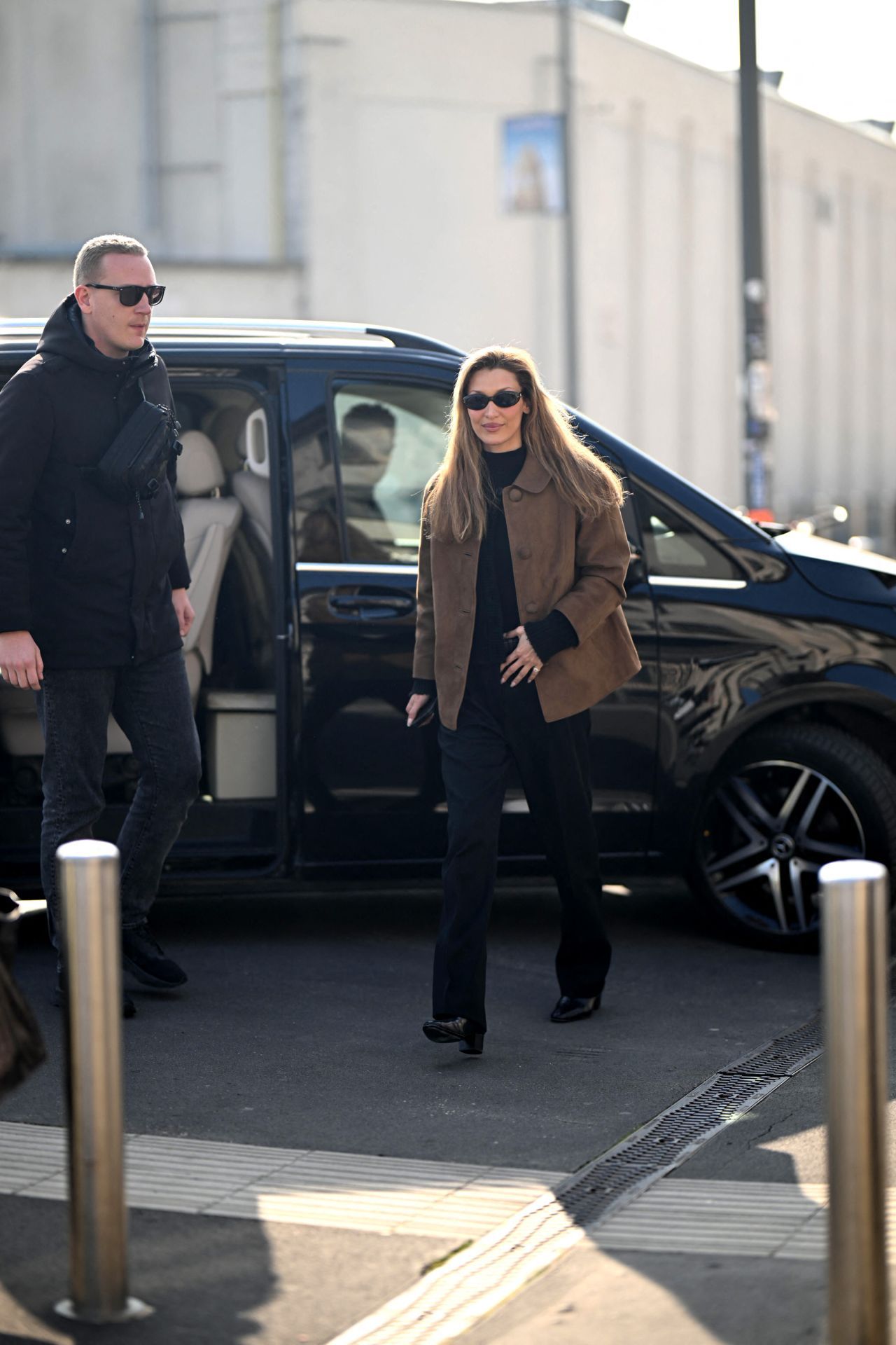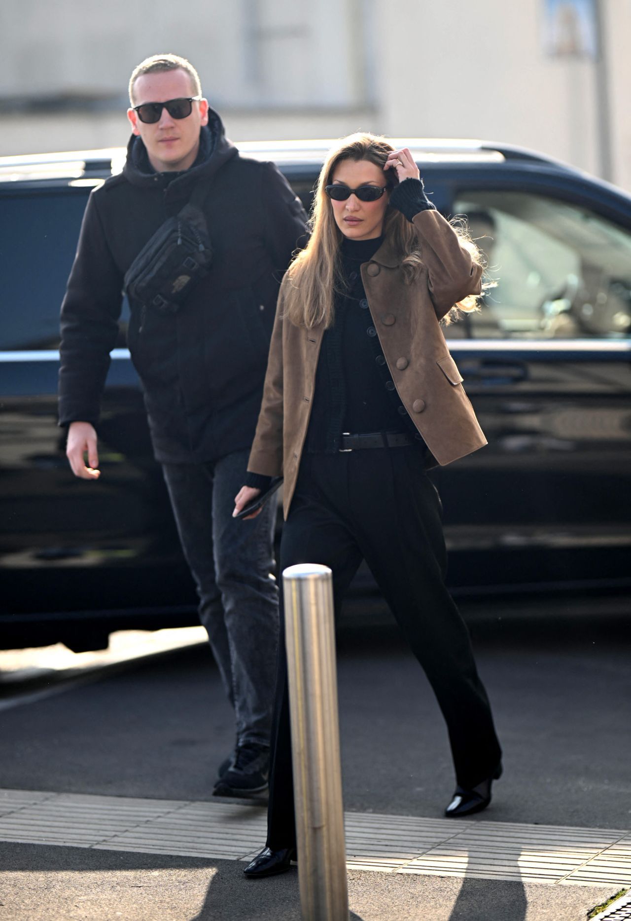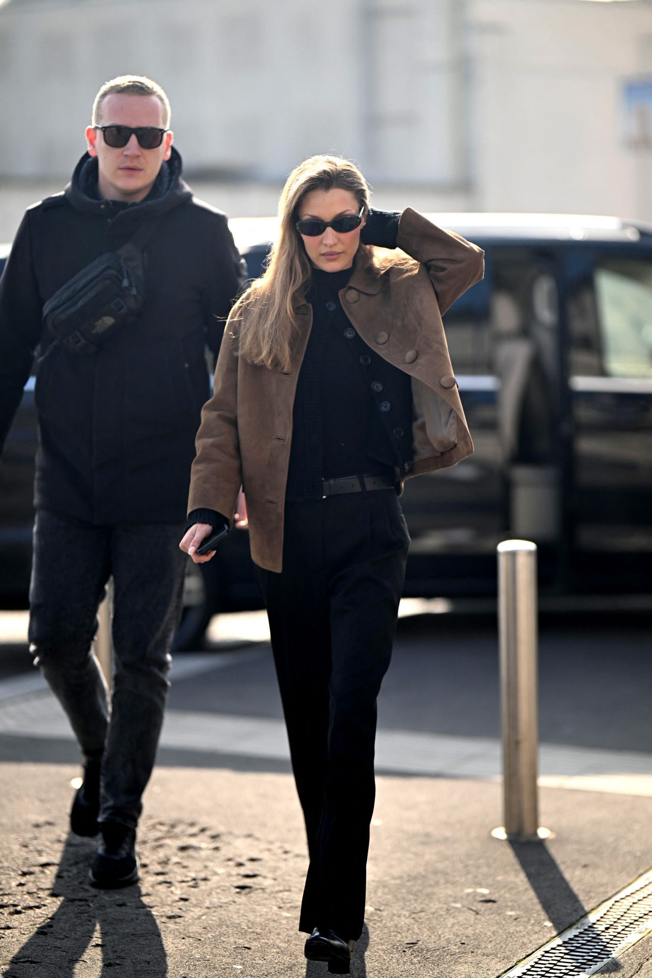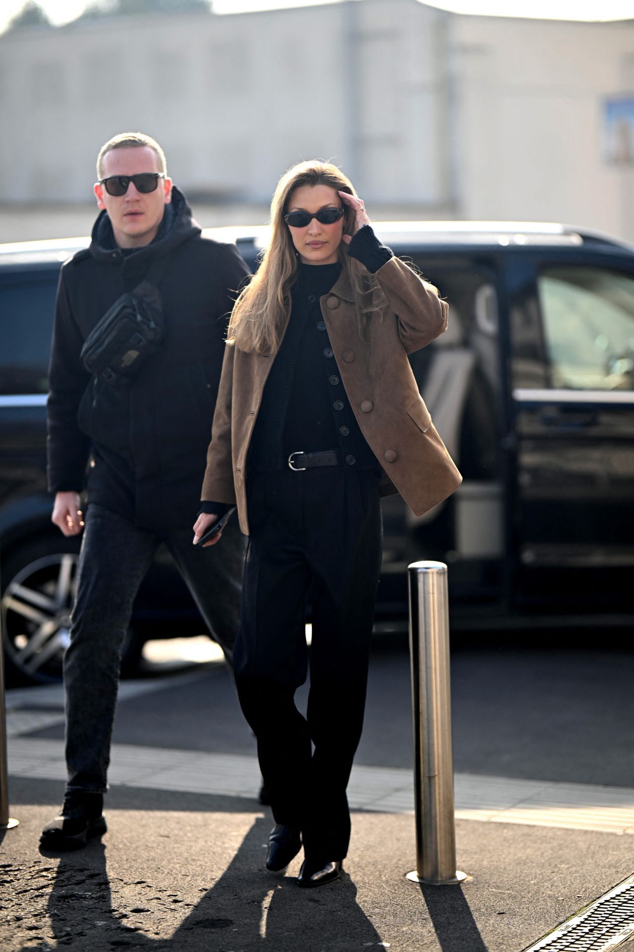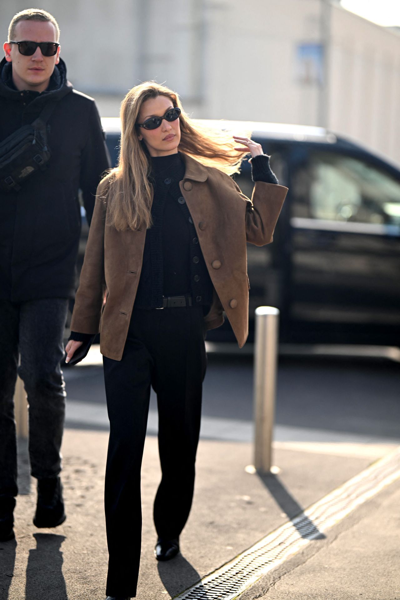 Bella Hadid 到米兰为Prada 走秀,秀场外街拍穿了两件外套叠穿,搭配黑色西裤,很有大佬的气场!超模穿搭米兰时装周