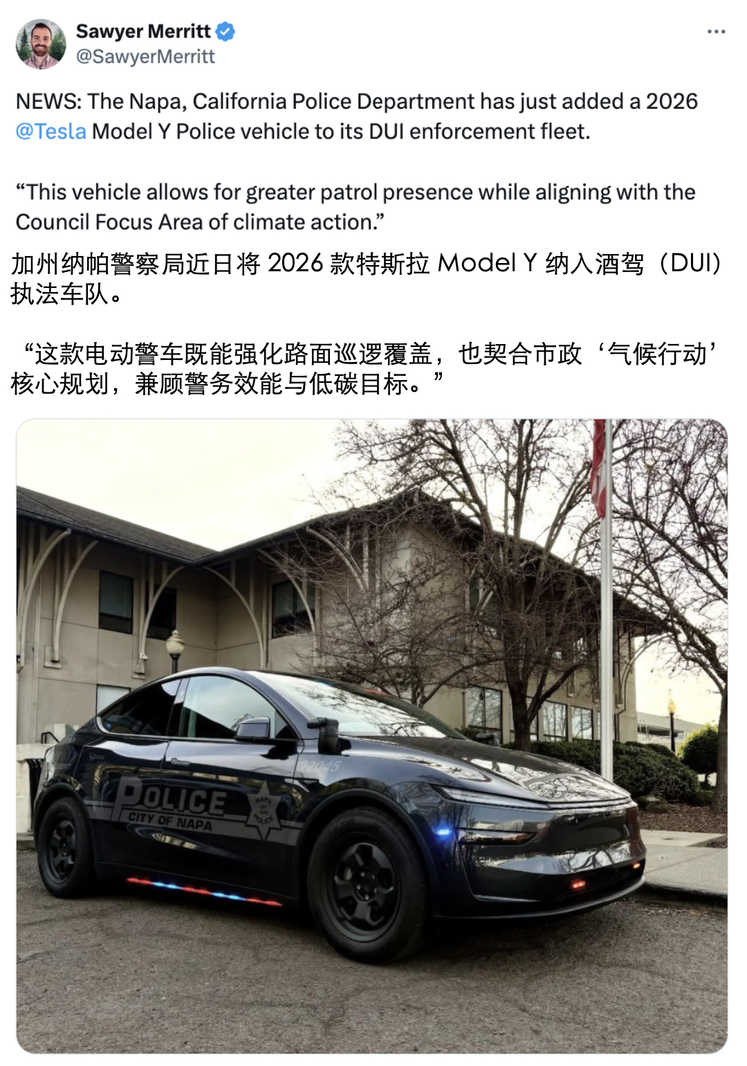 海外博主SawyerMerritt 称,加州纳帕警察局近日宣布将Model Y纳入酒驾执法车队,称该车既能提升巡逻效率,也为低碳执法树立了新典范。