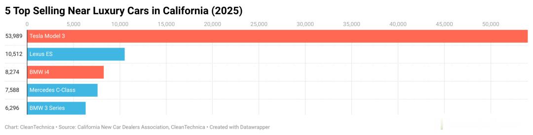 CleanTechnica的最新统计数据显示,Model 3同样展现出强劲实力,以累计超5万辆的销量成绩,成为加州2025年最畅销的豪华轿车。