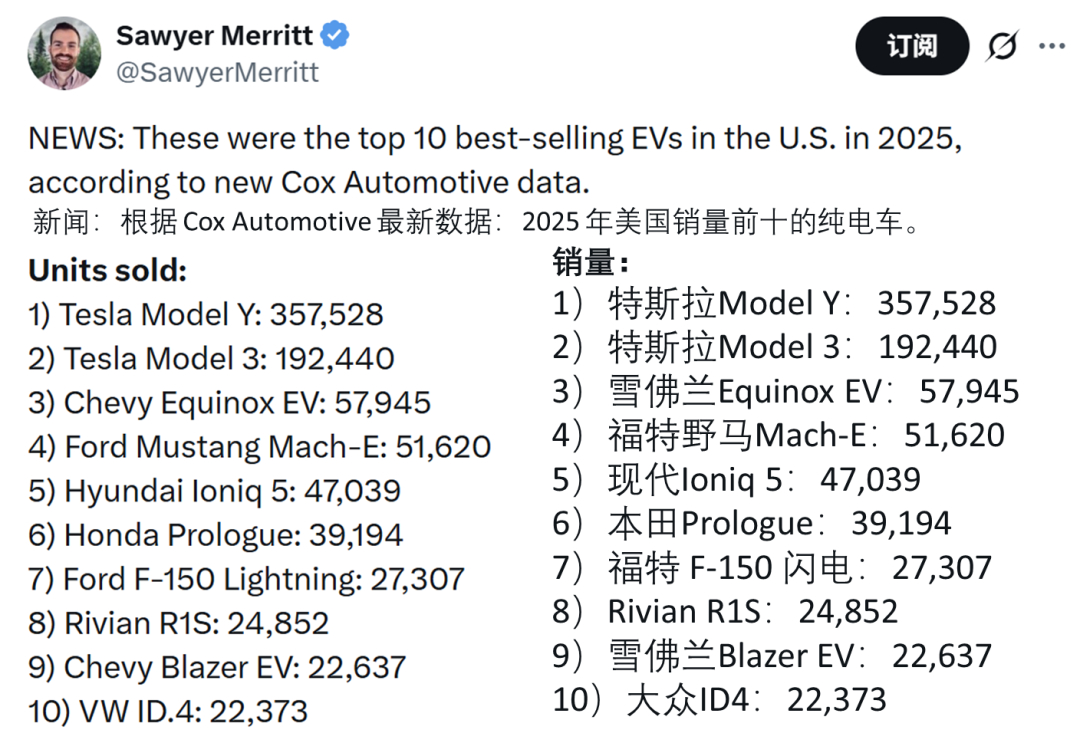 聚焦美国纯电动车市场,从海外博主SawyerMerritt 分享的数据来看,2025年Model Y与Model 3凭借超35.7万辆和19.2万辆的销量成绩,包揽纯电车销量冠亚军。