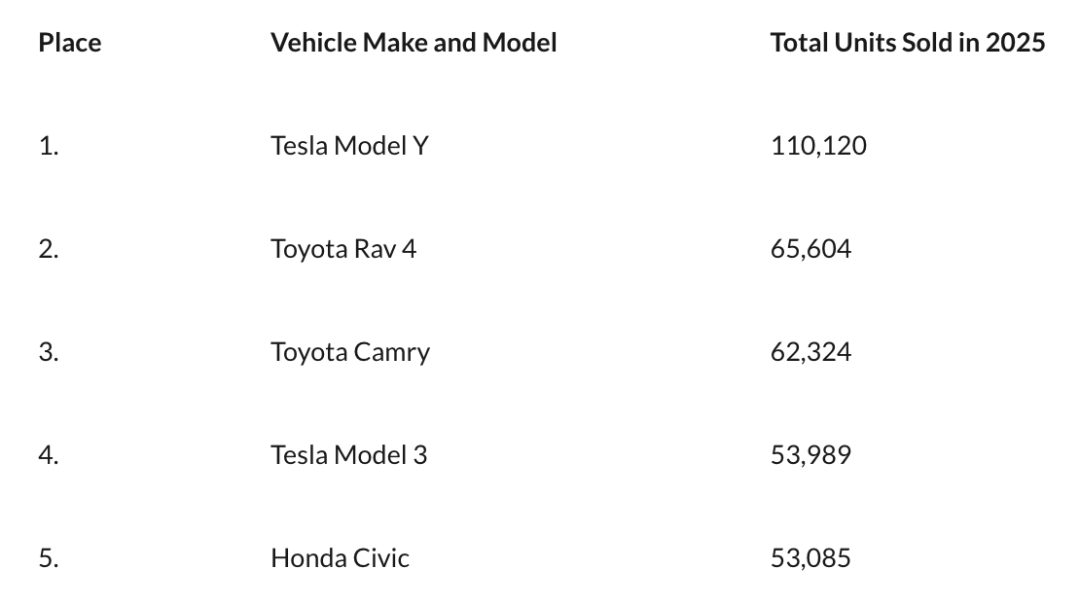 据外媒公布的最新数据,在2025年美国加州乘用车市场,特斯拉Model Y全年累计销量超11万辆,几乎是第二名车型销量的1.7倍,超越众多燃油车型。