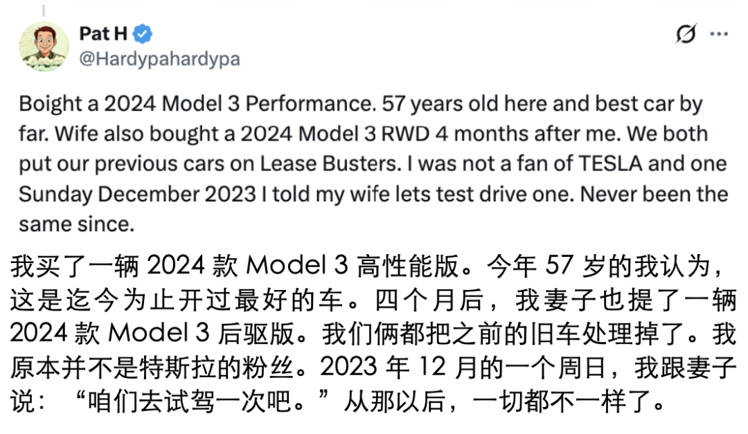 在他的亲身经历中,原本并非特斯拉粉丝的他,在一次偶然试驾后决定直接购入Model 3高性能版,表示“这是我开过最好的车”。四个月后,他的妻子也提了一辆Model 3。