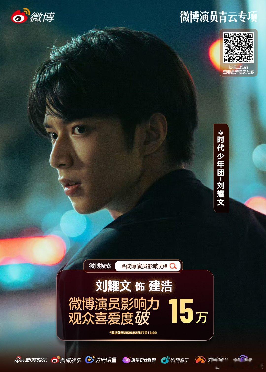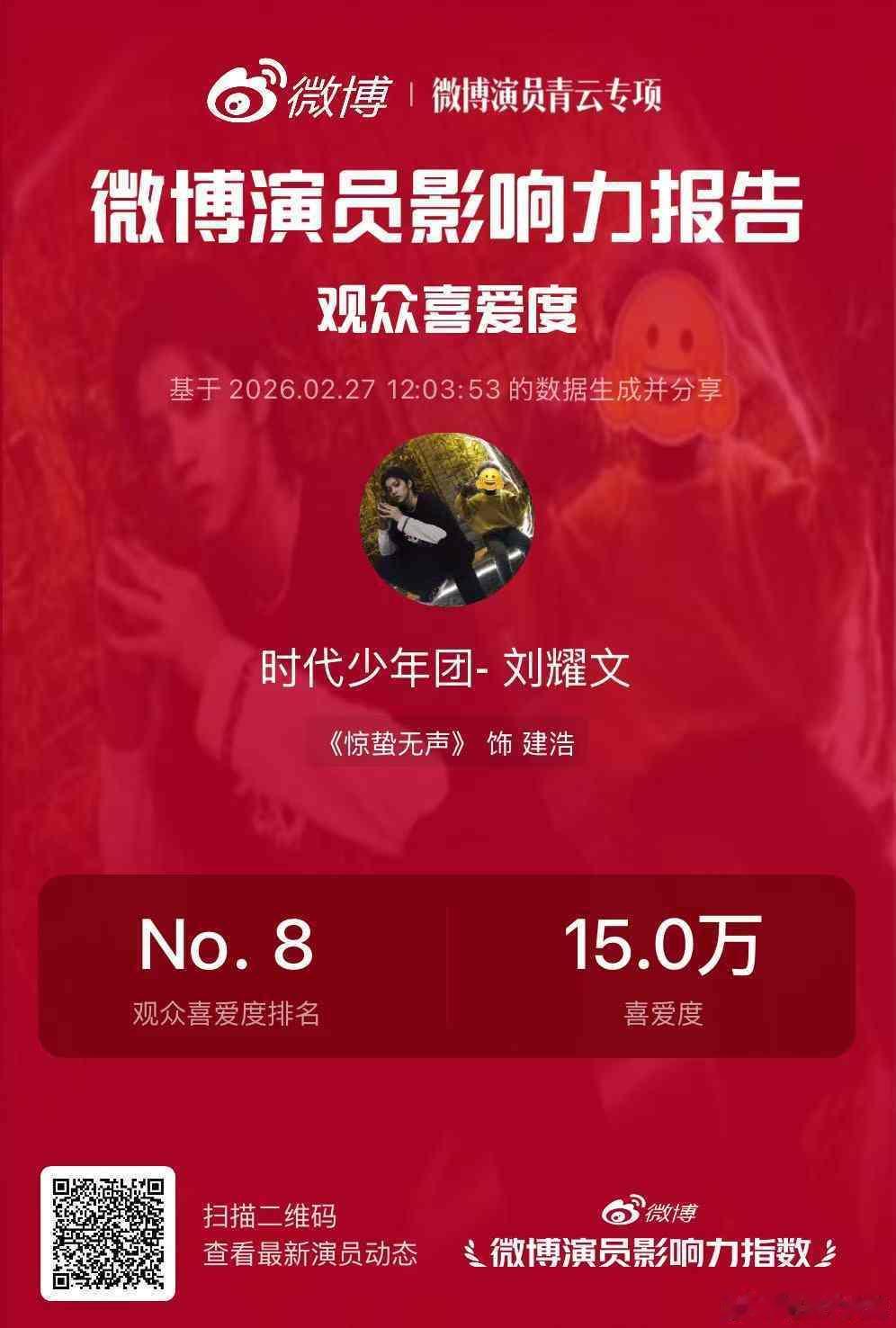 刘耀文建浩观众喜爱度破15万 🎉《惊蛰无声》建浩观众喜爱度达成15万里程碑!微博演员影响力