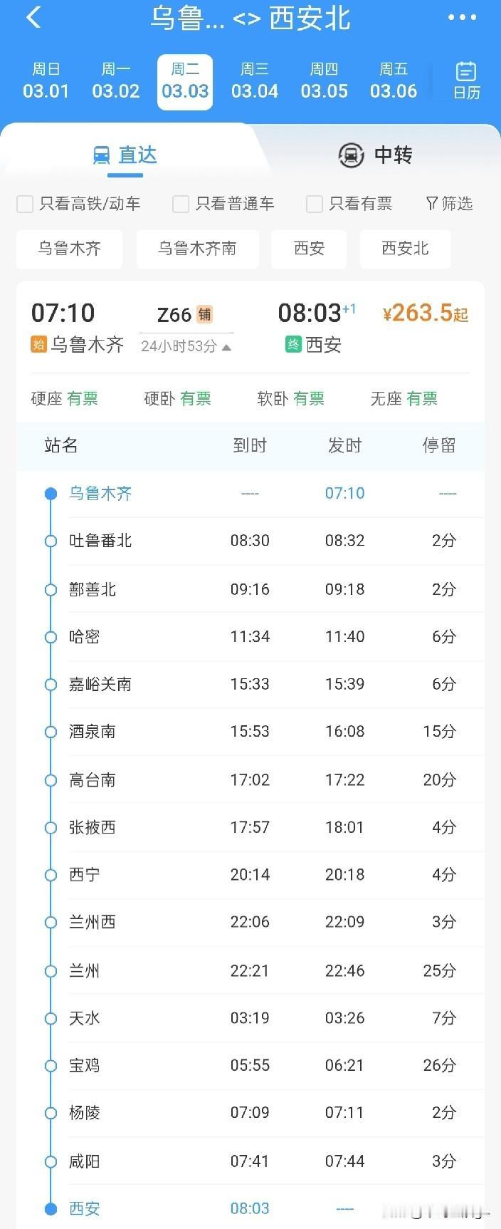 3月3日起,乌鲁木齐至西安增开Z66次直达特快列车,3月4日起增开返程列车,西新之间又一对列车直通 乌鲁木齐去往西安的列车有很多趟,主要也是很多趟列车都要经过西安,乌鲁木齐连接西安的,已经开行的还有两趟直达动车组列车,不过主力开行的多数车次还是普速列车。 2026年1月调图,原来的K366和K365次列车升级为Z66和Z65次列车,不过当时并没有直接开行,而现在3月3日起,这一对列车终于要开行了。新的直达特快列车,比老的K字头列车还要快很多,西安往返乌鲁木齐也是更便利了。 首先是直66次列车,3月3号乌鲁木齐7:10首发,第2天西安站8:03到达,全程历时24小时53分,恰好就是一天的时间,也将成为乌鲁木齐与西安之间往返最快的直达特快列车。 返程车,则是3月4号,西安站13点发车,第2天乌鲁木齐站15:42到达,全程需要26小时42分,时间加长了一些,但是票价往返都为263.5元起。