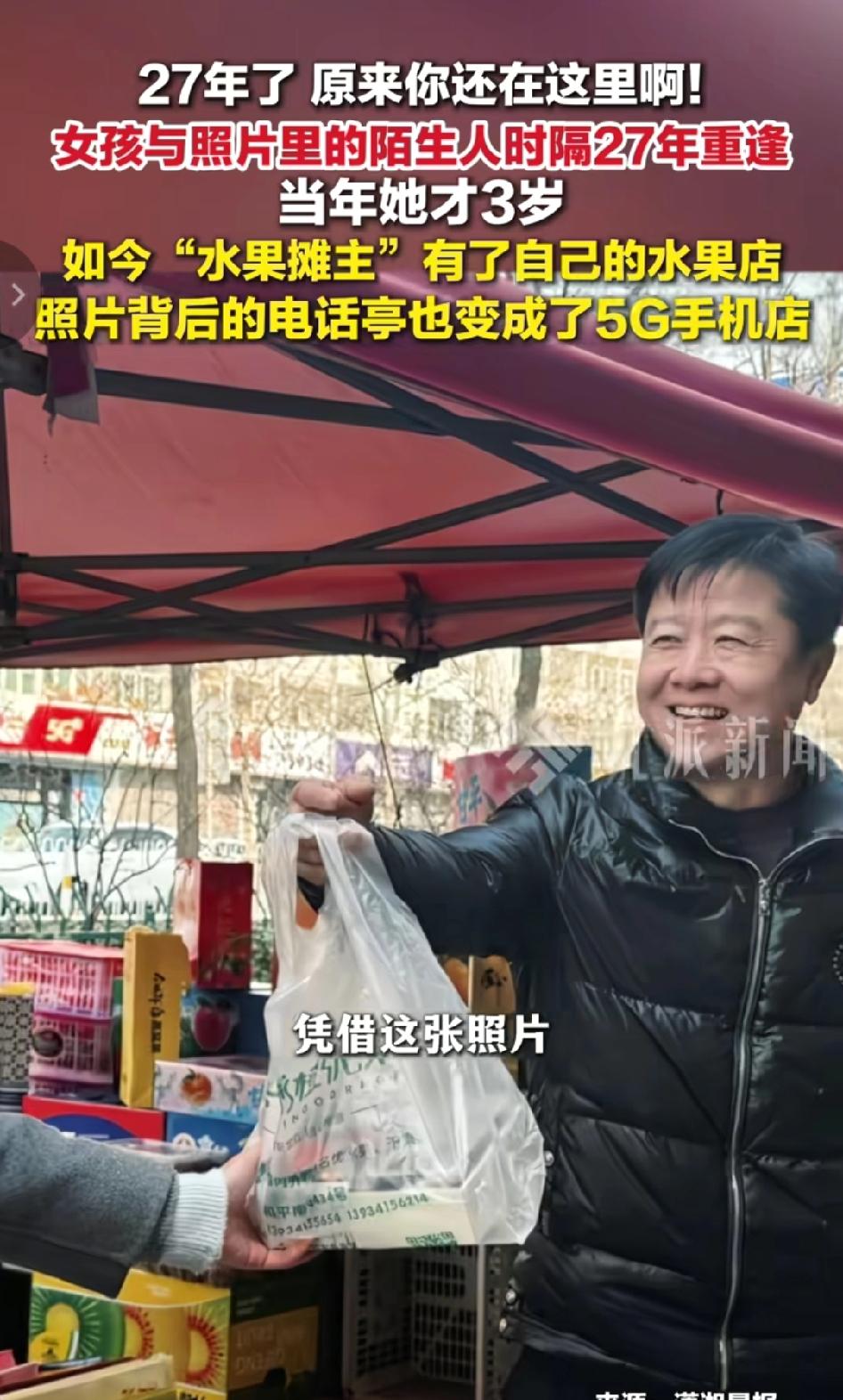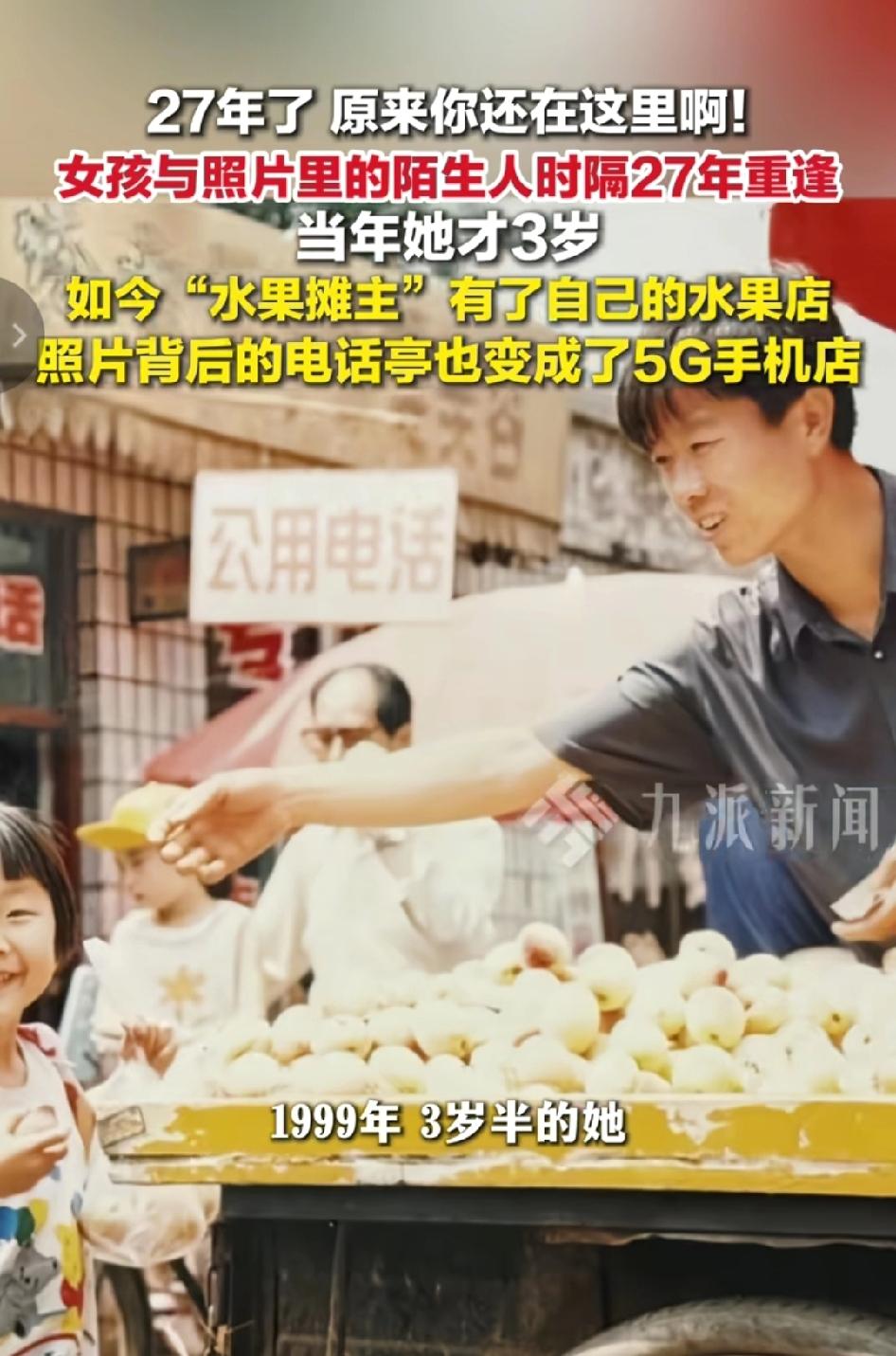 缘分太妙!1999年山西太原,3岁半小女孩在街头水果摊前被拍下一张照片;27年后,30岁的她凭着老照片寻回当年摊主。曾经的公用电话亭变成5G店,小贩杨先生也开起了自己的水果店,重逢时他依旧笑着递上一袋水果,时光温柔,人间值得。 1999年山西太原街头,年幼的小女孩站在水果摊前,摊主杨先生递上水果,身后的公用电话亭,成了一代人的时代记忆。谁也没料到,这随手一拍,竟埋下二十多年的温柔伏笔。 时光匆匆,当年的小不点长成大人,当年的街头小摊,也早已换了模样。 可就算过去再久,有些温暖永远不会被岁月冲淡。 27年后,30岁的她带着那张泛黄老照片回到太原,凭着记忆里的街景与轮廓一路打听、一路寻找,心里既紧张又期待,既怕找不到,又怕真的见面时恍如隔世。穿过熟悉又陌生的街道,对照着当年的视角反复比对,她终于在当年的位置附近,找到了开着实体店的杨先生。曾经的流动小贩,如今有了稳定的店面,当年破旧的公用电话亭,也早已换成明亮现代的5G手机店,一街一景,都写满了岁月变迁。 重逢那一刻,没有陌生,没有尴尬,杨先生一眼便明白了这份跨越27年的心意,依旧像当年那样温和憨厚,笑着转身从店里挑了一袋新鲜水果递给她,动作自然又亲切。她接过水果,看着眼前既熟悉又有些变化的面孔,一瞬间仿佛回到了3岁半那年的夏天,心里又暖又酸,万千感慨都化作一句轻轻的问候。两人在老地方重新合影,快门按下,定格下这段跨越时光、格外珍贵的温暖瞬间。 一场跨越时光的重逢,不只是遇见故人,更是遇见曾经的温柔与美好。 从一穷二白摆摊,到拥有自己的小店,杨先生用双手踏踏实实过日子,这就是普通人最动人的奋斗。 从公用电话到5G时代,从小摊到实体店,这不仅是个人的成长,更是一个时代向前的最好见证。 如果是你,会为一张老照片,去寻找当年给过你温暖的陌生人吗? 温暖瞬间 老照片的故事 时代记忆 人间温暖 晴风语说事 消息来源:九派新闻 及网络公开内容,本文配图/视频素材来自@ 九派新闻,以上仅用于内容分享,侵权即删,谢谢!