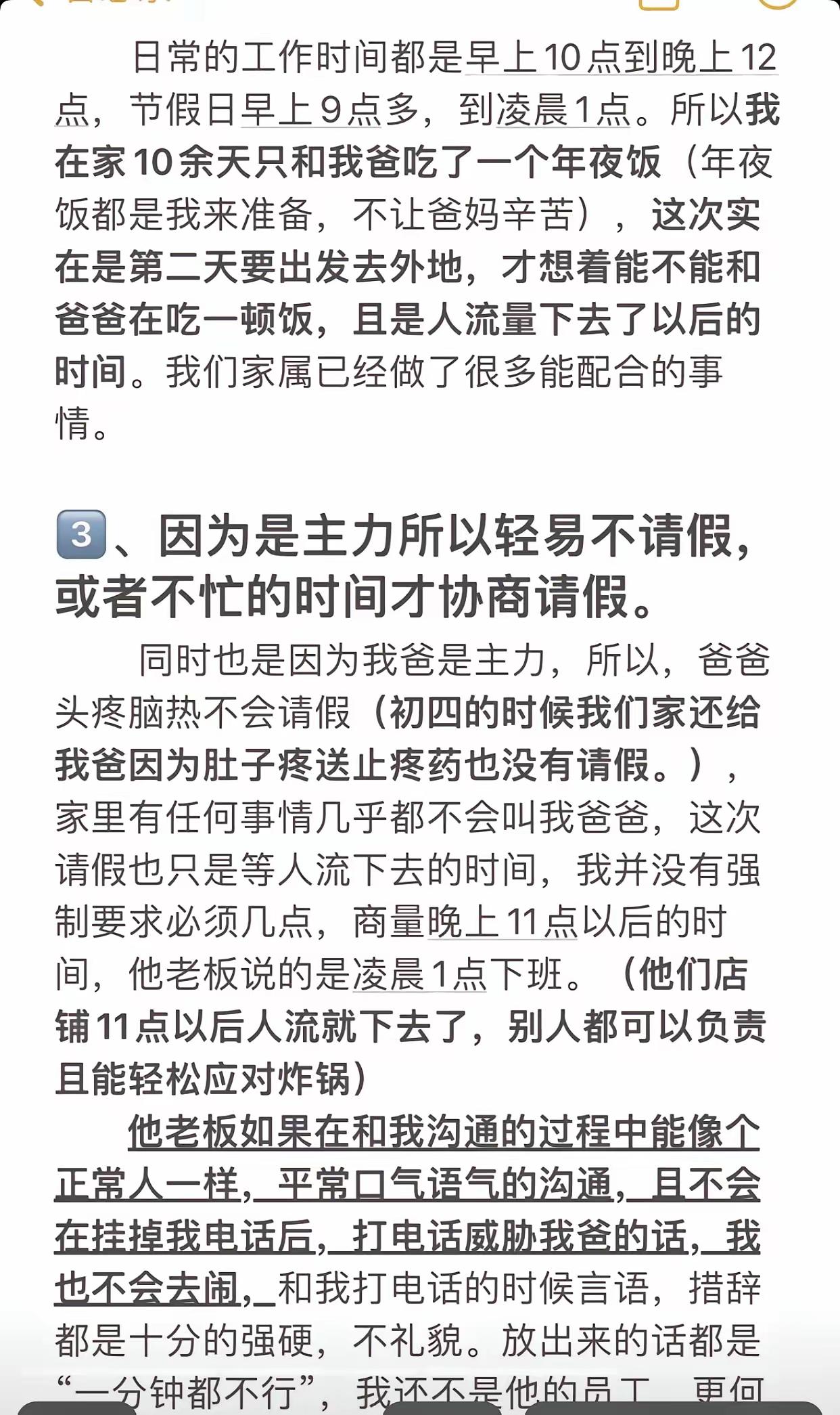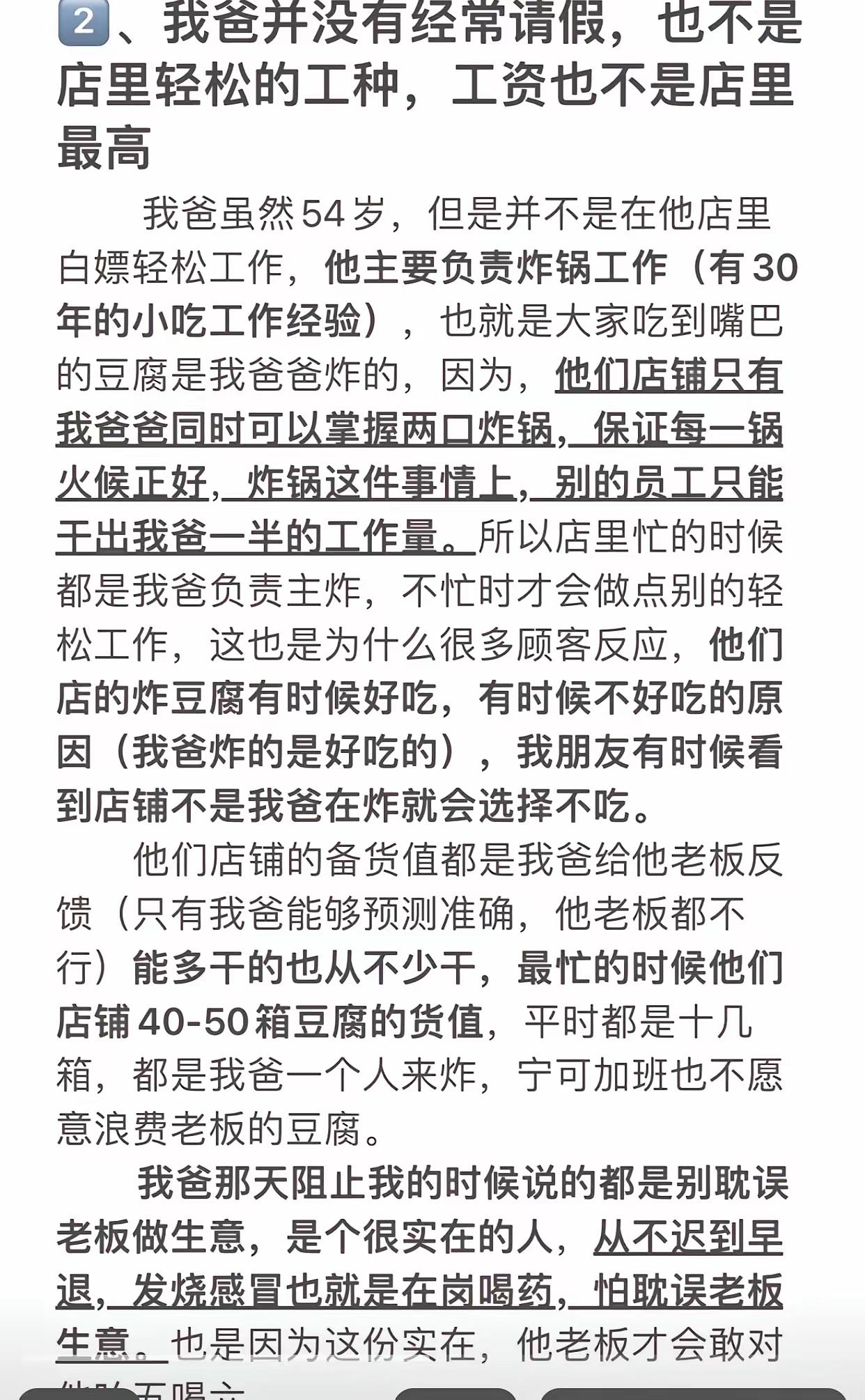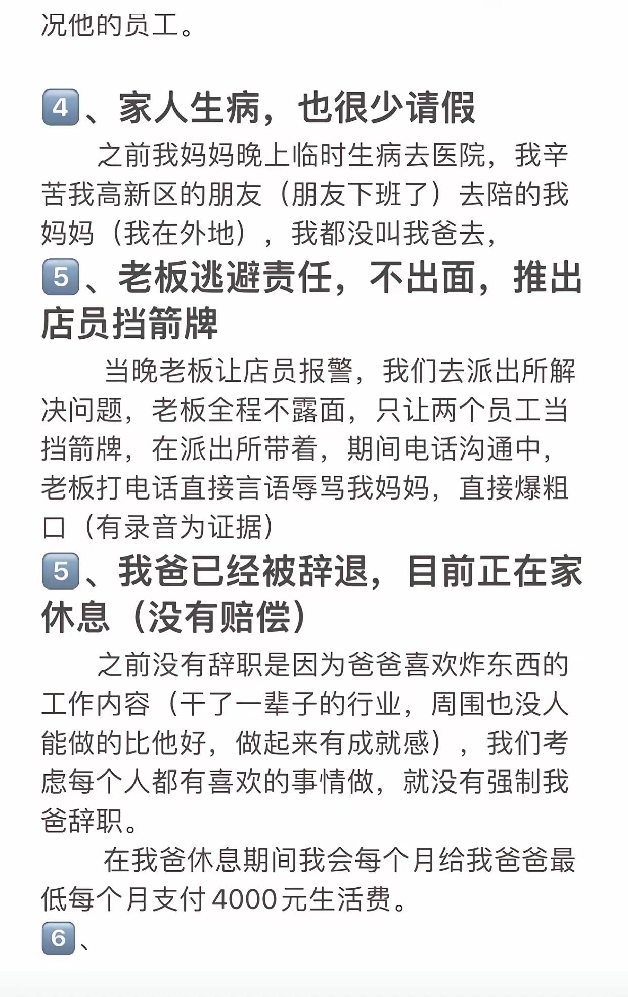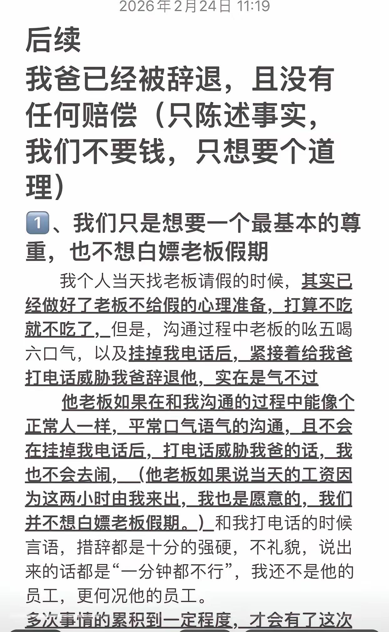 绝情臭豆腐果然够“绝情”,员工想请两个小时假陪家人吃顿饭被拒,转头还把员工给开除。最近济南宽厚里一女生站在臭豆腐店门口维权的视频,看的人心里十分气愤。 涉事员工从正月初一到初五全程在岗,每日早九点开工、凌晨一点收工,连续多日高强度工作没有换来半点体谅。员工的女儿即将返回外地工作,她只想在离家前和父亲吃一顿团圆饭,为了不影响店铺生意,专门挑夜间十一点后客流最少的时段申请两小时短假,她还主动跟老板说明,这两小时的工资可以全额扣除,所有损失由她承担。这样兼顾亲情与店铺利益的请求,没有得到任何商量的余地,老板只给出强硬回应,一分钟都不行。 拒绝请假只是开始,老板随后直接联系在岗员工,用严厉的语气指责训斥,当场宣布将员工开除,还明确告知不会提供任何补偿。这位员工在店内长期认真履职,没有出现工作差错,没有违反店铺的合理规定,仅仅因为一次合情合理的家庭诉求,就被无端剥夺工作机会,这样的处理方式完全不符合正常的用工逻辑。 餐饮小店的运营本就具备灵活调整的空间,两小时的短假处在低客流时段,完全可以通过临时调整岗位、简化操作流程等方式弥补缺口,不会对店铺营收造成实际影响。老板拒绝的核心原因不是经营压力,而是完全漠视员工的人格与需求,他把员工看作单纯的生产工具,不认可劳动者拥有休息、陪伴家人的基本权利。 按照劳动合同法相关规定,用人单位不得随意与劳动者解除劳动关系,劳动者因正当家庭事由申请事假,已提前沟通且未影响单位正常运营的,用人单位不得无故拒绝,更不能将此作为辞退理由。本次事件中,老板未给出合法合规的辞退依据,直接开除员工的行为属于违法解除劳动合同,员工有权向当地劳动监察部门投诉,也可通过劳动仲裁维护自身合法权益,索要对应的违法解除赔偿金。 视频发布后快速引发全网热议,大量网友表达愤怒与共情。很多打工人在评论区讲述自身遭遇,大家不满的不只是这一次请假被拒,更是小微企业中常见的无视劳动权益、缺乏人文关怀的现象。店铺以绝情臭豆腐作为店名,原本是吸引顾客的营销方式,经营者却把绝情落实在员工身上,用冰冷的态度消耗公众的好感。 做生意先学做人,餐饮行业的长久发展从来不只靠产品口味,更靠经营者的良知与格局。尊重员工、保障劳动者的合法权益,才能稳定团队、积累口碑,获得长期发展的可能。把压榨员工当成管理方式,用冷漠对待付出汗水的劳动者,就算短期能获得收益,也终究会失去顾客与市场。 宽厚里作为济南知名商圈,承载着城市的烟火气息与人文温度,这家店铺的做法,既伤害了劳动者,也与商圈的整体氛围相悖。依法用工、善意待人,是所有经营者不能突破的底线,突破这条底线,再有意思的店名,也留不住顾客,更走不长远。 尊重从来不是口头表达,而是藏在对他人需求的体谅里。两小时的团圆时间,是普通人最基础的情感需求,守住这份温情,才是经营与生活该有的样子。 各位读者你们怎么看?欢迎在评论区讨论。
