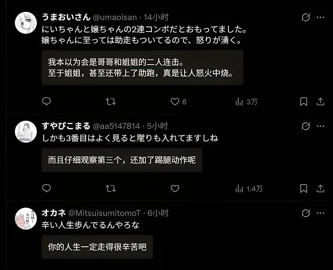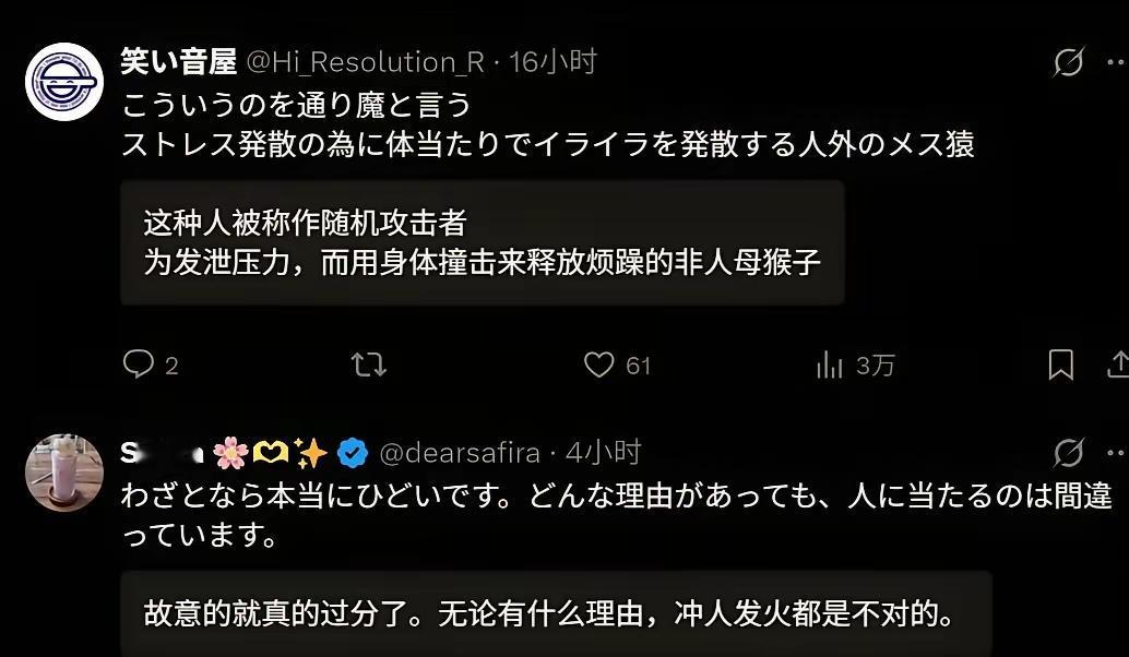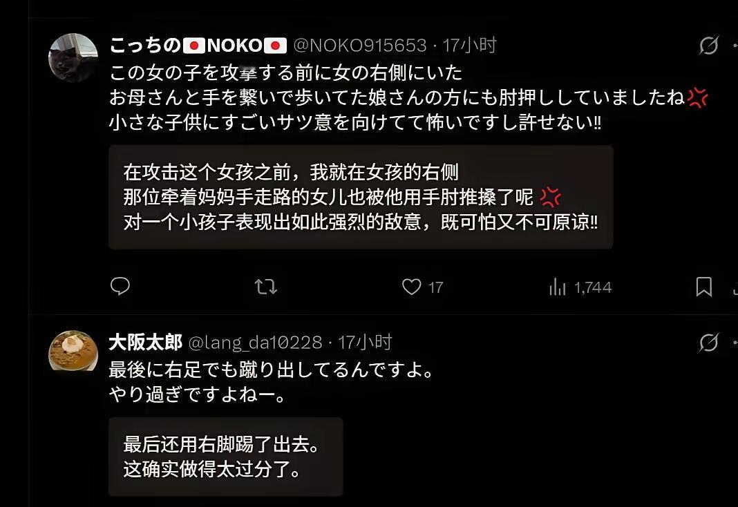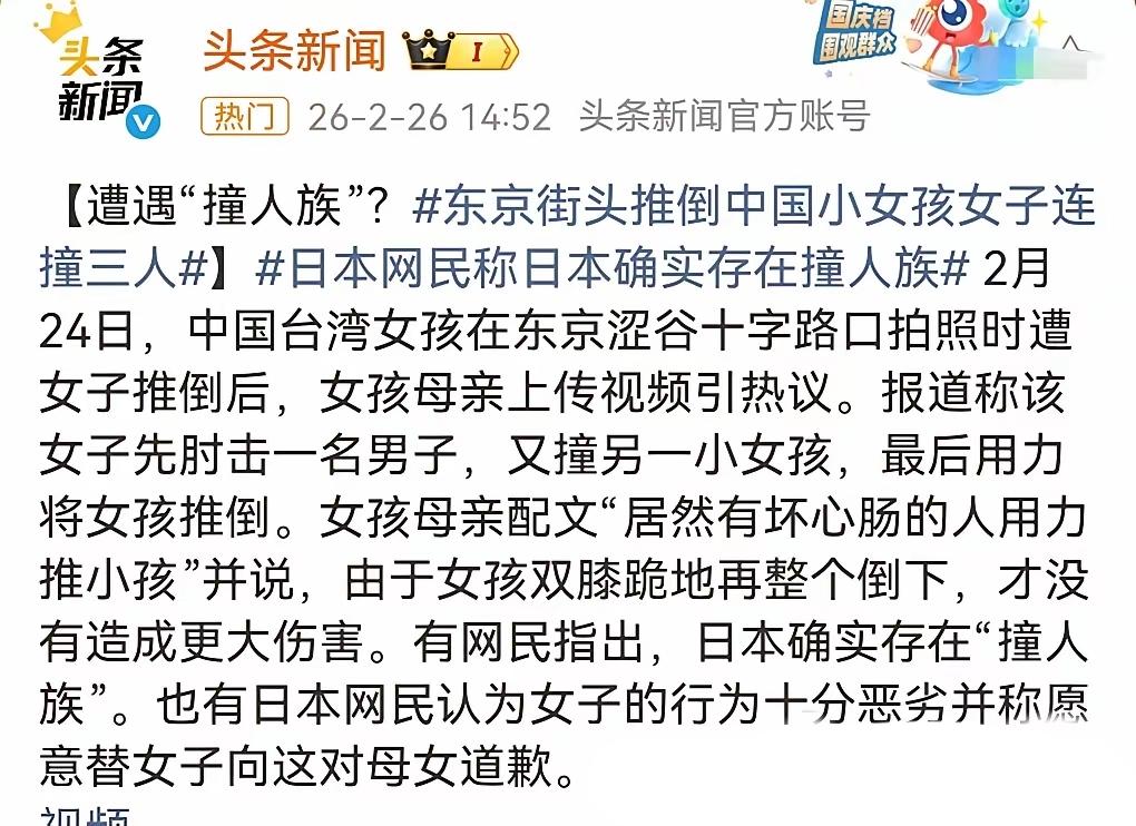 🤯 日本大妈撞倒台湾小女孩,日本网友怒了!台湾岛内却有人疯狂洗白?这波操作我真的看不懂! 台湾省小女孩被日本大妈撞倒,现在舆论主要两派,说起来挺有意思:台湾很多人替日本大妈辩解,反而是日本人多在指责撞人大妈! 起因是在东京涩谷,一台湾小女孩高高兴兴地在站人行道上拍照,这时候后边走过来一位戴口罩穿蓝色衣服的日本大妈,只见她非常不耐烦地先是用手肘撞击一名男子,接着又撞另外一个小女孩,然后就把台湾小女孩给推倒了,然后连看都没看一眼径自离开。好在女孩先是双膝跪地,然后才整个倒下,没有造成较大伤害。 对于日本大妈的行为,日本网友比较中立,说确实会一些暴躁的大妈会做出这种无理的事情,无论因为什么她都不应该这么做。还有人愿意为此事道歉、因此而蒙羞。 反观台湾网友,有好多人还替大妈洗白呢,有人说“本来工作一天就很烦躁,看到这种不遵守规则的人就是想撞开……”还有人“这是日本,如果是台湾撞你的可能是车哦……” 就,让人觉得很难评啊! 这种是非不分的逻辑确实让人费解。身为中国人,去到别人的土地,却不认同自家文化里“尊老爱幼、与人为善”的基本教养,反而为这种粗鲁行径找借口,这不是理性,是丢了根。真正的独立思考,是明辨对错,而非盲目站队。希望这位小女孩能平安开心,也希望某些人能早日找回正确的价值观,别再在国际场合让自家孩子难堪了。