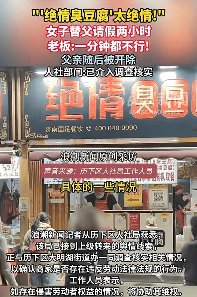 “绝情”臭豆腐店真绝情!女儿替父请 2 小时离别假,老父亲转头被开除:有些老板,只剩 “绝情” 没人性 女儿要远走他乡,想和父亲吃顿离别饭,深夜主动替父请假 2 小时,还愿意扣工资,不耽误生意,如此通情达理,换来的却是老板一句 “一分钟都不行”,甚至当场威胁开除。 更让人寒心的是,父亲全程没离岗、没耽误工作,第二天依旧被无情开除。没有提前通知,没有任何补偿,一句冰冷的 “不用来了”,就打碎了一个普通打工人的生计。 这哪里是管理严格,分明是毫无人情味的压榨。员工不是机器,是有家人、有感情、要生活的人。连一顿团圆饭都容不下,连最基本的共情都没有,这样的老板,守得住生意,守不住人心。 规矩是死的,人是活的。真正的管理,是情理兼顾,而不是拿着规章制度当镰刀,肆意收割员工的尊严与生活。 打工人勤勤恳恳,不是为了换来这般冷漠对待。愿每一份付出都被尊重,每一次正当诉求都不被践踏,别让打工人,连尽一份孝心都要提心吊胆。 女子替父请假 父亲竟因此被开除