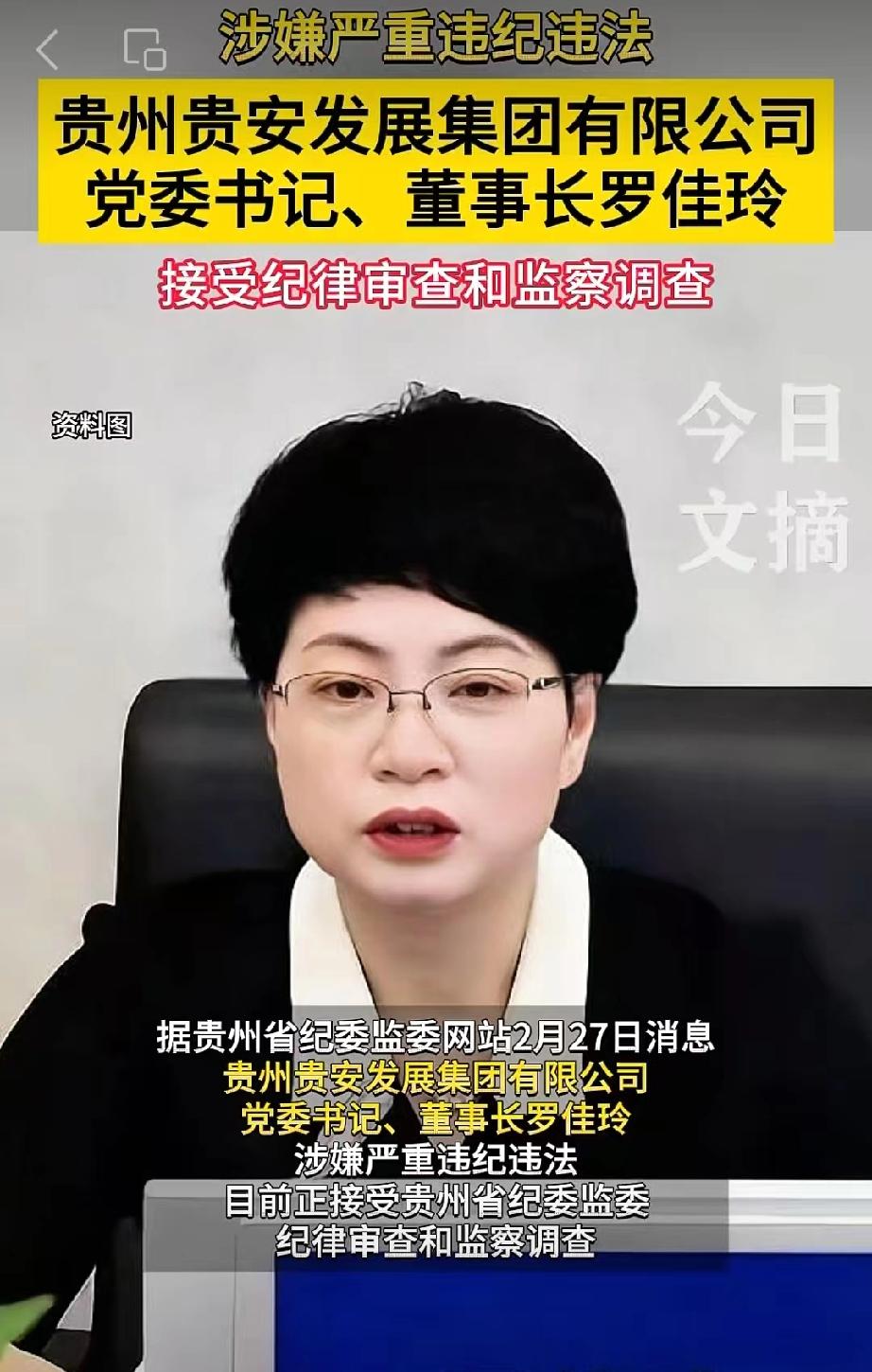 今天刷到贵州贵安发展集团有限公司党委书记、董事长罗佳玲栽了的消息,真是叹息。 叹息她真的是糊涂啊! 她是1971年8月生人,今年快55岁。布依族,学历也不低,拥有大学学历,又是工程学硕士。不光学历高,而且还是一名高级政工师,高级经济师。 单从官网发布的照片来看,也能看出她平时特别注重保养,黑色西装内搭白色衬衫,皮肤甚是白皙,脸上画着精致的妆容,头发理得很短,这一套短发造型尽显干练。虽然已经年过半百,但是依旧风韵犹存。 她从参加工作以后便在贵阳市深耕。 早年期间在贵阳市新世纪建设综合开发有限公司办公室工作,之后晋升为该公司的团委书记,监事会秘书。 2009年,升任贵阳市城市建设投资集团副总经理。 在国企工作多年之后,于2013年履新贵阳市政府金融办副主任。两年之后,晋升为主任。 2018年又迎来了工作变动,被推荐为贵阳银行党委副书记、行长人选。2019年6月,正式担任贵阳农村商业银行党委委员、监事长。 2022年7月被推荐为贵安新区开发投资有限公司董事、董事长、总经理人选。 2022年10月,贵安新区开发投资有限公司更名为贵州贵安发展集团有限公司。 2023年1月,52岁的罗佳玲,被任命为贵州贵安发展集团有限公司董事,董事长,总经理。在这一核心岗位上,工作时间不短。一直到此番落马。 这里的贵州贵安发展集团有限公司,是贵州省人民政府于2012年10月,批准组建的省属国有大型企业,现为贵安新区管委会直属的国有控股公司。该公司注册资本达203亿元人民币,也是推动贵安新区产城融合发展的核心平台。 关于她最近一次公开露面,应该是在今年的2月12日,也就是春节前夕,当时贵安发展集团召开2026年度工作会议,作为集团党委书记、董事长的罗佳玲出席会议并讲话。 没想到,这个春节还没有过完,罗佳玲便彻底栽倒在了任上,再也吃不上正月十五热气腾腾的元宵了。 纵观她的人生履历,曾经长期在贵州省城建、金融系统以及国有企业担任重要领导职务。 可以说是一手好牌,如今打的彻底稀烂。 当官宣落马消息发布的那一刻,也预示着她春风得意的好日子走到了终点,在55岁的年纪身陷囹圄,真可谓:贪心不足蛇吞象,最终害人又害己。