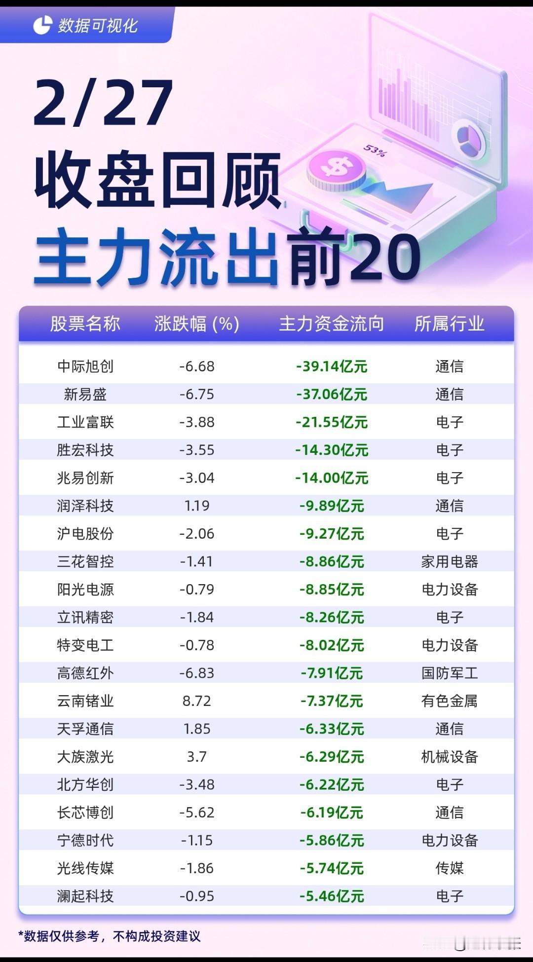 27日收盘资金榜揭晓! 主力资金大调仓,有色、计算机成核心吸金池,电子、通信遭巨额抛售。 个股层面,拓维信息、湖南黄金等获主力资金亿元级猛攻,涨停收盘;中际旭创、新易盛则被超30亿元资金砸盘,跌幅显著。 板块轮动加速,资金弃高就低迹象明显,有色与计算机板块的强势表现,或成为短期市场主线风向标。