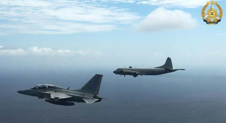 菲律宾武装部队公共事务办公室27日发布了前一日在最北端的巴丹斯群岛上空的拍摄的照片。 照片显示,菲律宾空军FA-50战斗机(左)与日本海上自卫队P-3猎户座海上巡逻机并肩飞行,进行联合巡逻。 菲律宾、美国和日本军队本周在巴士海峡附近举行了联合演习,该演习旨在展示三国“在复杂海洋环境下无缝协同作战的能力”。 从地理位置上看,巴士海峡将菲律宾这个群岛国家与中国台湾分隔开来,令人警觉。