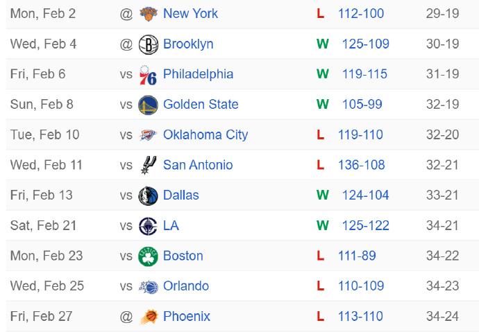 湖人二月份战绩:5胜6负! 其中8连主场,湖人只拿到了4胜4负,战绩非常不理想。 而整体来看,有3场比赛输的比较可惜,分别是对阵残阵雷霆,对阵魔术,对阵残阵太阳,其中被魔术和太阳完成了准绝杀,两场合计输了4分。 2月份的比赛打完,湖人掉到了西部第6的位置,只领先太阳1个胜场差,随时有跌入附加赛的可能。 在打完8连客回归主场的时候,湖人万万没想到会是如今这幅光景。