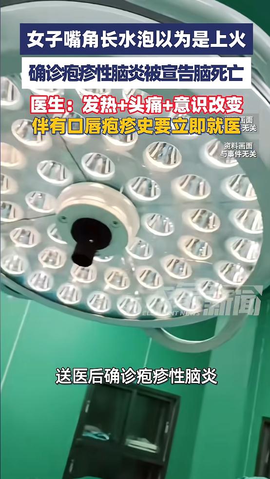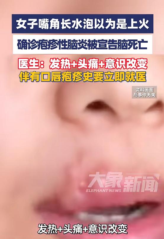 “悲剧还是发生了!”近日,陕西,一女子嘴角长了小水泡,以为是上火引起的“烂嘴角”,没放在心上,可涂药和喝凉茶都没效果,随后病情恶化,不仅面部麻木,还发起了高烧,送医后确诊为疱疹性脑炎,被医生宣告脑死亡!网友:太吓人了! 最近陕西一位三十多岁的张女士,经营着一家餐馆,平日里起早贪黑地忙活,没日没夜地连轴转,身体早就处于高强度运转的状态。 那天她突然感觉嘴角有点刺痛,一看长了几颗小水泡,心里也没当回事,觉得就是最近天气干燥、自己劳累过度上火了,大家常说的“烂嘴角”而已。她随手找了点消炎的药膏涂上,就接着忙着店里的生意,压根没想着这小水泡会惹出大麻烦。 可谁能想到,这小水泡不仅没好转,反而越长越大,嘴角红肿的范围也跟着扩大,疼得越来越厉害。婆婆看她难受,就给她熬了些土方凉茶,想着能败败火,可喝下去之后一点改善都没有。 更让人不安的是,张女士开始觉得脸颊周围发麻,紧接着发起了高烧,浑身没力气,连站都站不稳。 她只好关了店门,去药店买了点退烧药吃,本以为退了烧就没事了,可到了晚上,情况彻底失控了。 她嘴角的伤口红肿得吓人,还一个劲地呕吐,吃进去的东西全吐了出来,整个人意识都开始模糊。家人这才意识到不对劲,吓得魂都没了,赶紧连夜把她送到了当地医院。 到了医院检查后,医生说根本不是普通的发热,而是严重的感染,赶紧安排了脑部和血液的一系列检查,最后确诊的结果让所有人都惊呆了——疱疹性脑炎! 原来一开始嘴角那不起眼的小水泡,根本不是什么上火,而是单纯疱疹病毒引起的。就因为一开始没重视,这病毒已经悄悄侵犯了她的中枢神经系统,导致脑组织严重水肿发炎,任凭医生怎么全力抢救,都没能挽回她的生命,最终张女士被宣告脑死亡。好好的一个人,就因为一个小水泡没当回事,就这样没了,想想都让人心里发寒。 生活里,谁没遇到过嘴角长水泡的情况?几乎所有人第一反应都是“上火了”,要么自己涂药膏,要么喝凉茶,要么硬扛着等自愈,压根不会往病毒感染上想。可我必须严肃地说,这真的是个天大的误区,好多人都被这个误区害了! 嘴角长水泡,十有八九不是什么上火,而是单纯疱疹病毒在作祟,这种病毒特别顽固,一旦感染上就会终身潜伏在身体里,平时不出来捣乱,可一旦身体免疫力下降,比如熬夜、劳累、压力大、受凉的时候,它就会冒出来兴风作浪。 一旦这病毒突破了身体的防御,侵入到中枢神经系统,就会引发疱疹性脑炎,这可是要命的病!这种脑炎发展速度特别快,短短几天内就可能让病情急转直下,出现高烧、剧烈头痛、呕吐、意识模糊、抽搐这些症状,要是救治不及时,死亡率特别高,就算侥幸活下来,也可能留下失语、癫痫、记忆力丧失这些严重的后遗症。 很多人觉得这种倒霉事不会轮到自己,可医生说了,就算是平时身体健康的人,也有可能出现这种严重情况,尤其是中老年人、长期熬夜劳累的年轻人,风险更高。 我真的特别想提醒大家,别再把嘴角水泡当小事了!身体给出的任何一个小信号,都可能是在提醒我们要重视健康。很多人就是因为太粗心,觉得小毛病不用去医院,自己处理就行,结果硬生生把小问题拖成了大悲剧。 上火是什么?上火更多是身体的一种亚健康状态,可能会口干舌燥、牙龈肿痛,但很少会出现成簇的小水泡,更不会引发那么严重的脑炎。那些所谓的土方凉茶、消炎药膏,对付病毒根本没用,反而会耽误最佳的治疗时间。 单纯疱疹病毒引起的水泡,一开始可能只是有点刺痛、灼热感,接着会长出一簇小水泡,还会红肿发痒,这些症状和上火完全不一样。 只要出现这些情况,就别自己瞎折腾了,赶紧去医院看看,医生会用专门的抗病毒药物治疗,早治疗早好,还能避免病毒扩散。 更重要的是,一旦出现水泡,再加上发烧、头痛、头晕、身体麻木这些症状,不管多忙,都得立刻去医院急诊科,千万不能等,每一分钟都很宝贵,晚了可能就真的来不及了。 预防这种病毒也没那么复杂,平时注意个人卫生,不跟别人共用毛巾、餐具、牙刷,避免接触那些长了水泡的人,尤其是在水泡没结痂之前,别跟他们亲吻、密切接触。 还有就是一定要提高自己的免疫力,别熬夜,别过度劳累,饮食均衡点,多锻炼锻炼身体,保持好心情,免疫力强了,病毒自然就不敢出来捣乱了。家里有老人和小孩的,更要格外注意,他们的免疫力相对较弱,更容易被感染,也更容易出现严重症状。 我真的不想再看到张女士这样的悲剧重演了,一个小水泡,就因为一个错误的认知,夺走了一条生命,毁掉了一个家庭,实在太可惜了。 希望大家都能记住这个教训,别再轻视身体上的任何一个小异常,尤其是嘴角长水泡这种看似普通的情况,一定要及时就医,明确诊断,别自己瞎处理。健康永远是第一位的,有时候多一份警惕,就能少一份危险,别等到悲剧发生了才追悔莫及。
