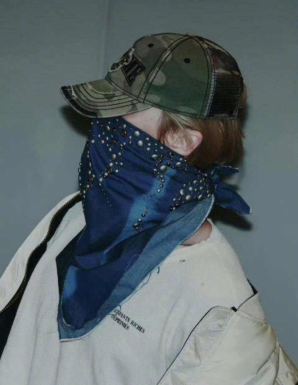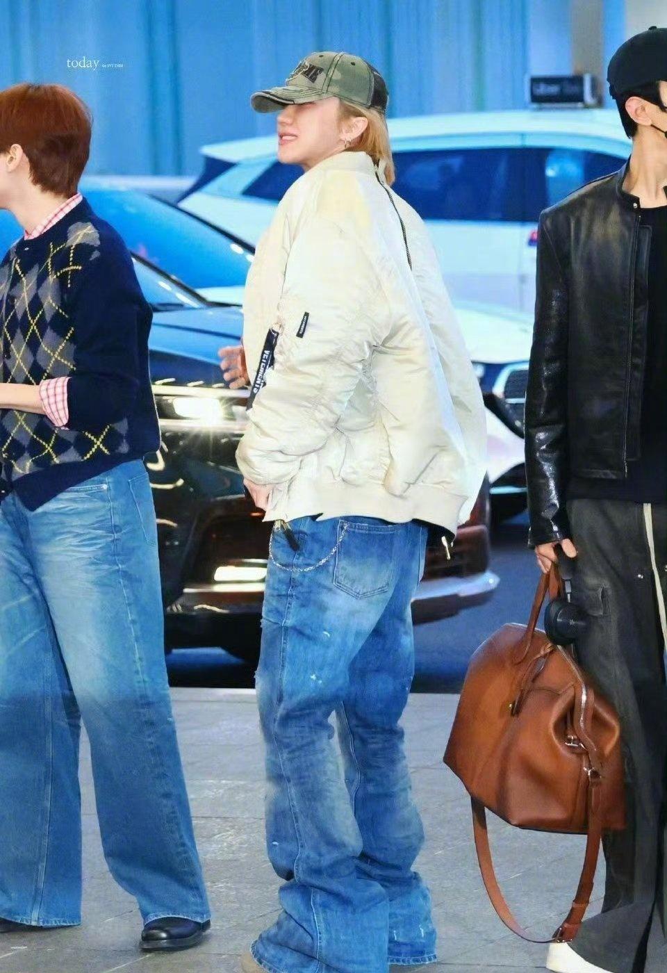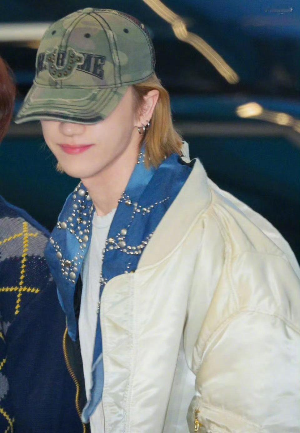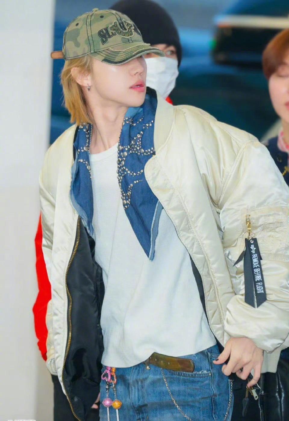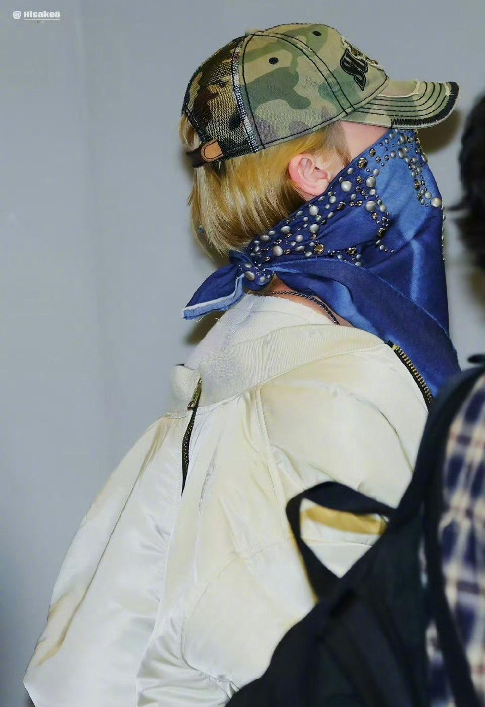 @徐明浩_The8 今日机场出发路透造型帅气曝光!以飞行员夹克混搭印花棒球帽,尽显清爽高级的街头魅力。独特的蓝色铆钉丝巾蒙脸Look神秘又张力十足,魅力有型震撼登场。[赞]