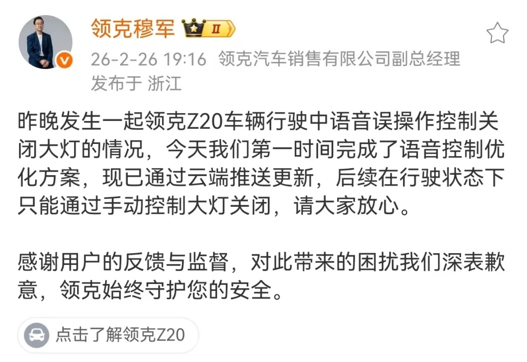 领克的穆军也随即发了个微博,之后关闭大灯的操作只能通过手动调整,不知道作为领克车主对这样的回复还满意吗。前段时间的四路行车记录仪还没有一个满意的解决方案,现在又搞出了不严谨的操作,还是希望车企能在车主发现问题之前先解决问题,别让车主失望啊