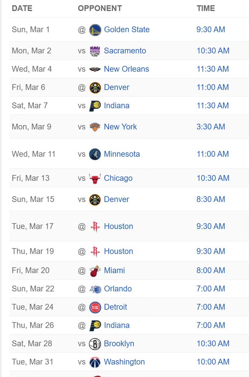 湖人常规赛进入收官阶段了,即将到来的三月,湖人先从勇士主场开始,总计17场比赛,9个主场8个客场,三个背靠背。 下面作一下简单预测吧: 3月1日,客场对阵金州勇士 ,湖人胜,刚经历三连败,必须赢! 3月2日,主场对阵萨克拉门托国王 ,湖人胜,国王重建球队,没有战斗力! 3月4日,主场对阵新奥尔良鹈鹕 ,跟打国王一样,轻松拿捏! 3月6日,客场对阵丹佛掘金 ,应该会输球,湖人的尿性,连赢几场后输球! 3月7日,主场对阵印第安纳步行者 ,东部垫底球队,主场作战必须拿下! 3月9日,主场对阵纽约尼克斯 ,五五开吧!但是,湖人主场迎战,5分左右赢球! 3月11日,主场对阵明尼苏达森林狼 ,这场球必须拿下,事关晋级季后赛名额! 3月13日,主场对阵芝加哥公牛 ?!?!?!?!不好说! 3月15日,主场对阵丹佛掘金 ,必须拿下,上一场预测输给掘金,主场必须拿下! 3月17日,客场对阵休斯顿火箭 ,火箭胜! 3月19日客场对阵休斯顿火箭 ,湖人胜, 3月20日,客场对阵迈阿密热火 ,湖人胜 3月22日,客场对阵奥兰多魔术 ,湖人胜,报上一场被绝杀的仇! 3月24日,客场对阵底特律活塞 ,活塞胜,湖人打不过! 3月26日,客场对阵印第安纳步行者 ,湖人胜 3月28日,主场对阵布鲁克林篮网 ,湖人胜 3月31日,主场对阵华盛顿奇才 ,湖人胜,没有悬念