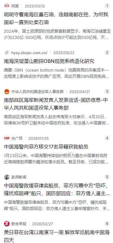 南海已经不是咱们印象中的那个南海了,如果再继续闹下去,那么菲律宾很有可能成为咱们崛起之路上的一颗“垫脚石”。 麻烦看官老爷们右上角点击一下“关注”,方便您进行讨论和分享,感谢您的支持! 说起南海,很多人的印象还停留在碧海蓝天、渔船点点,但现实中的南海,早已是另一番景象。这片海域底下埋着的,可不仅仅是漂亮的珊瑚礁,而是实打实的战略资源。根据中国自然资源部门勘探的数据,南海的石油地质储量相当可观,保守估计在230亿吨以上,乐观的话甚至能达到550亿吨,这还不算那些巨量的天然气资源 。咱们国家虽然守着这个“聚宝盆”,却一直没急着动手大规模开采,这可不是没技术或者没能力,而是有着更深远的考量。相比于把自己地底下的宝贝赶紧挖出来换成钱,国家更倾向于把南海油气作为长远的战略储备,宁可先从中东进口石油,也要把这些“家底”留给子孙后代,留着应对未来不可知的风险 。 当然,不开采还有一个很现实的原因,那就是南海的油虽然多,但真不好挖。咱们那些有潜力的油田,大多藏在深水区,水深动辄上千米,比如“深海一号”气田,作业水深就达到了1500米 。在那种地方开采石油,技术难度和成本完全不是一回事。有资料显示,在南海深水区开采一桶石油,成本可能高达60到80美元,这个价格在国际市场上毫无优势可言。而且深海开采面临的是极端的地质条件和恶劣的海况,虽然咱们国家这些年进步飞快,“深海一号”这样的重大项目也实现了突破,但不得不承认,部分顶尖的核心设备和技术,目前还得依赖国际合作或者进口,这也是客观存在的短板 。 就在咱们忙着搞建设、谋发展的时候,邻国菲律宾那边却一直不太平。最典型的例子就是去年4月20号,菲律宾一艘36号护卫艇未经咱们允许,直接闯进了黄岩岛附近的海域。这可不是渔船误闯,而是正儿八经的军舰挑衅。中国人民解放军南部战区反应也很迅速,立马组织兵力跟上去,盯着它,最后把它给警告驱离了 。这种事儿这几年不是第一次发生,说白了,就是有人在试探咱们的底线,故意在南海把水搅浑。 要说最让人寒心的,还得是今年1月份发生的一件事。当时有一艘外籍货轮在黄岩岛附近海域倾覆,船上有不少菲律宾籍船员落水,情况万分危急。中国海警接到求救信号后,二话没说,第一时间就冲到了事发海域,顶着风浪救起了17名船员,还给人提供吃的、喝的,安排医疗检查,可以说是仁至义尽 。结果呢?好心没换来好报。菲律宾那边有些人不仅不感激,反而转过头来就和美国一唱一和,污蔑中国海警在那一带“恐吓”他们的船只,还继续搞军事挑衅 。这种“恩将仇报”的做法,真是让人大开眼界,也让大家彻底看清楚了,谁是真心维护地区和平,谁是在背后挑事儿的。 菲律宾之所以敢这么有恃无恐地闹腾,明眼人都看得出来,背后是有“老大哥”在撑腰。美国这几年把战略重心往亚太转移,一直想找个抓手来遏制中国的发展,菲律宾的地理位置和那点历史纠葛,正好被人家给看上了。美国不断给菲律宾递刀子,嘴上喊着“航行自由”,实际上就是想把菲律宾当成对抗中国的前哨基地,巴不得南海乱起来,这样他们才好从中渔利,维护自己在亚太地区那点快要保不住的霸权 。菲律宾有些人还觉得自己挺聪明,傍上了大腿,殊不知在大国博弈的棋盘上,棋子往往是用来牺牲的。 说起来也挺讽刺,菲律宾这么闹腾,最后会是什么结果?如果咱们换个角度看,他们这种持续的挑衅,反而像是在给咱们“帮忙”。正因为外部压力不断,逼着咱们的海洋开采技术必须加速突破,不能再慢悠悠地搞了。你看这几年,“深海一号”投产了,惠州26-6油田也开发了,深海装备技术越搞越硬气 。以前咱们可能还顾忌这顾忌那,现在倒好,压力变动力,南海的资源开发反而按下了快进键。 再往深了想,菲律宾这么闹,实际上是在帮咱们“立规矩”。以前南海这片儿,有些规矩是模糊的,有些事儿是不好办的。现在他们一次次闯进来,咱们一次次依法驱离、跟踪监视,国际社会看多了也就习惯了,慢慢就形成了新的惯例。比如黄岩岛,以前可能还有争议,现在咱们实际管控得滴水不漏,菲律宾来一次咱们赶一次,时间长了,这种管控就成了既定事实 。从这个角度说,菲律宾不是在给咱们使绊子,而是在帮咱们划红线。 所以说,南海还是那个南海,但南海的格局已经不是以前那个格局了。咱们国家在处理这事儿上,既有耐心也有手段,一边抓紧时间搞技术突破,一边稳扎稳打搞实际管控。如果菲律宾继续这么执迷不悟,非要给美国当这个“马前卒”,那最后的结果很可能就是:他们每一次的挑衅,都像一块砖,铺在了咱们国家崛起和民族复兴的道路上。等到哪天咱们回过头看,菲律宾还真有可能成了咱们崛起路上那块关键的“垫脚石”。