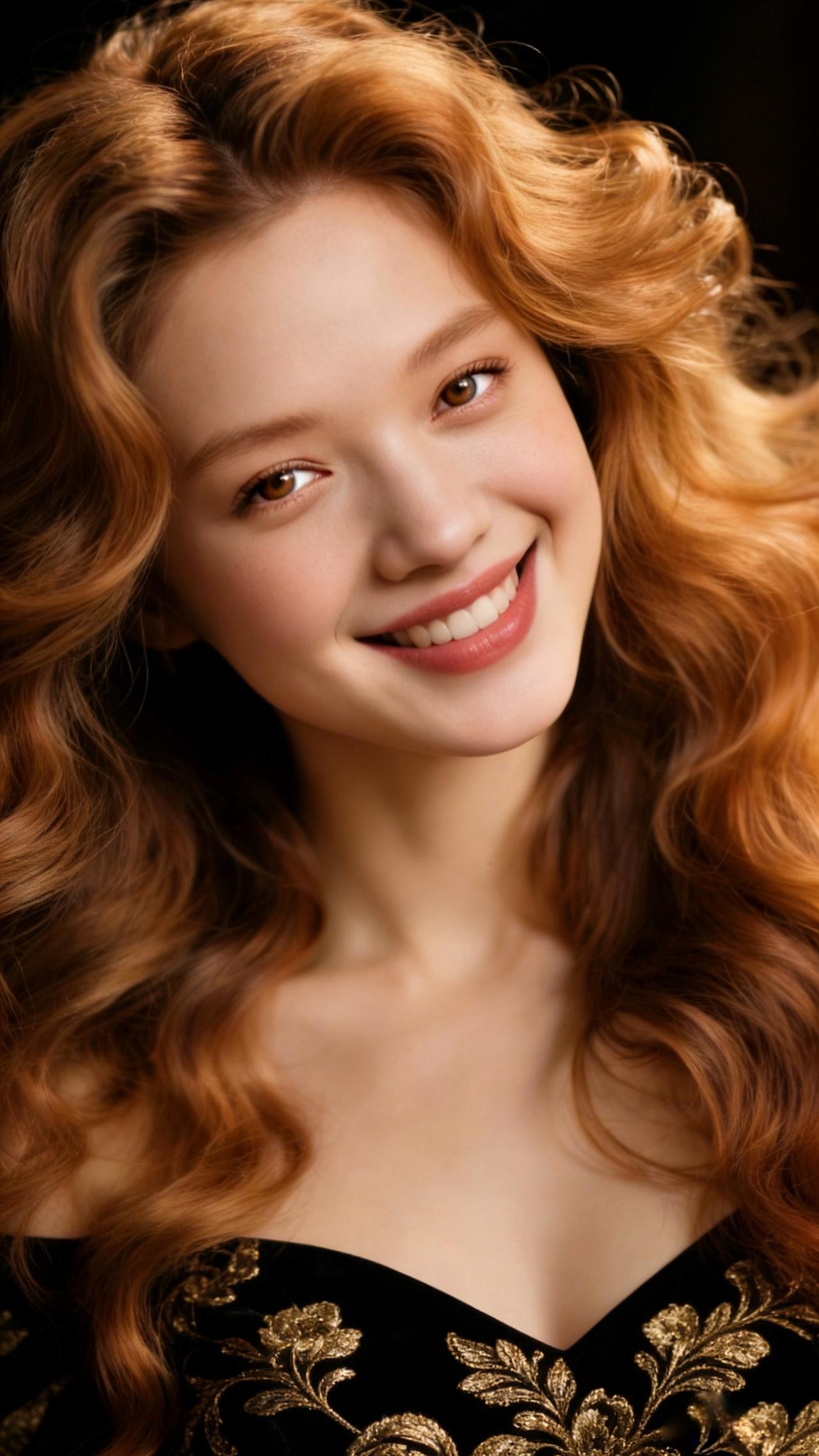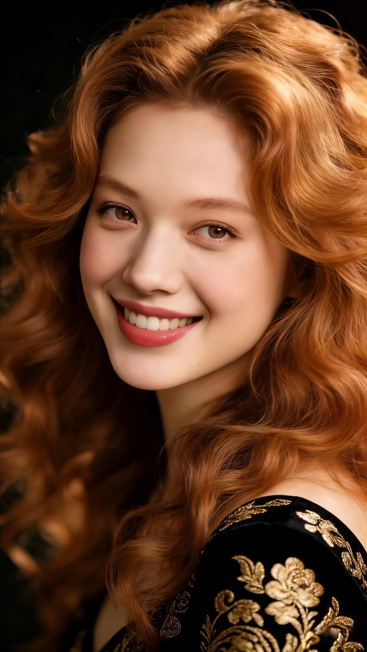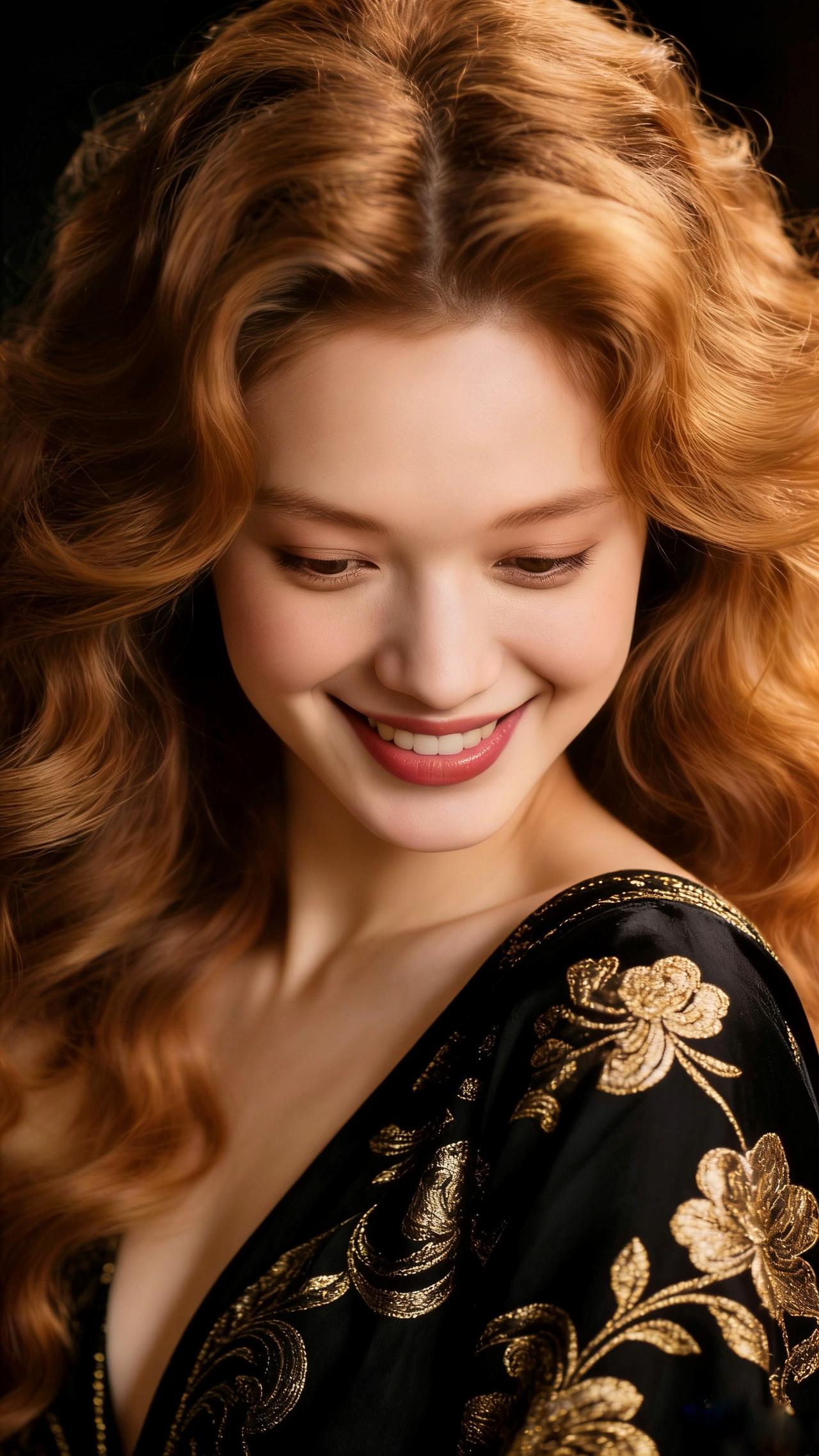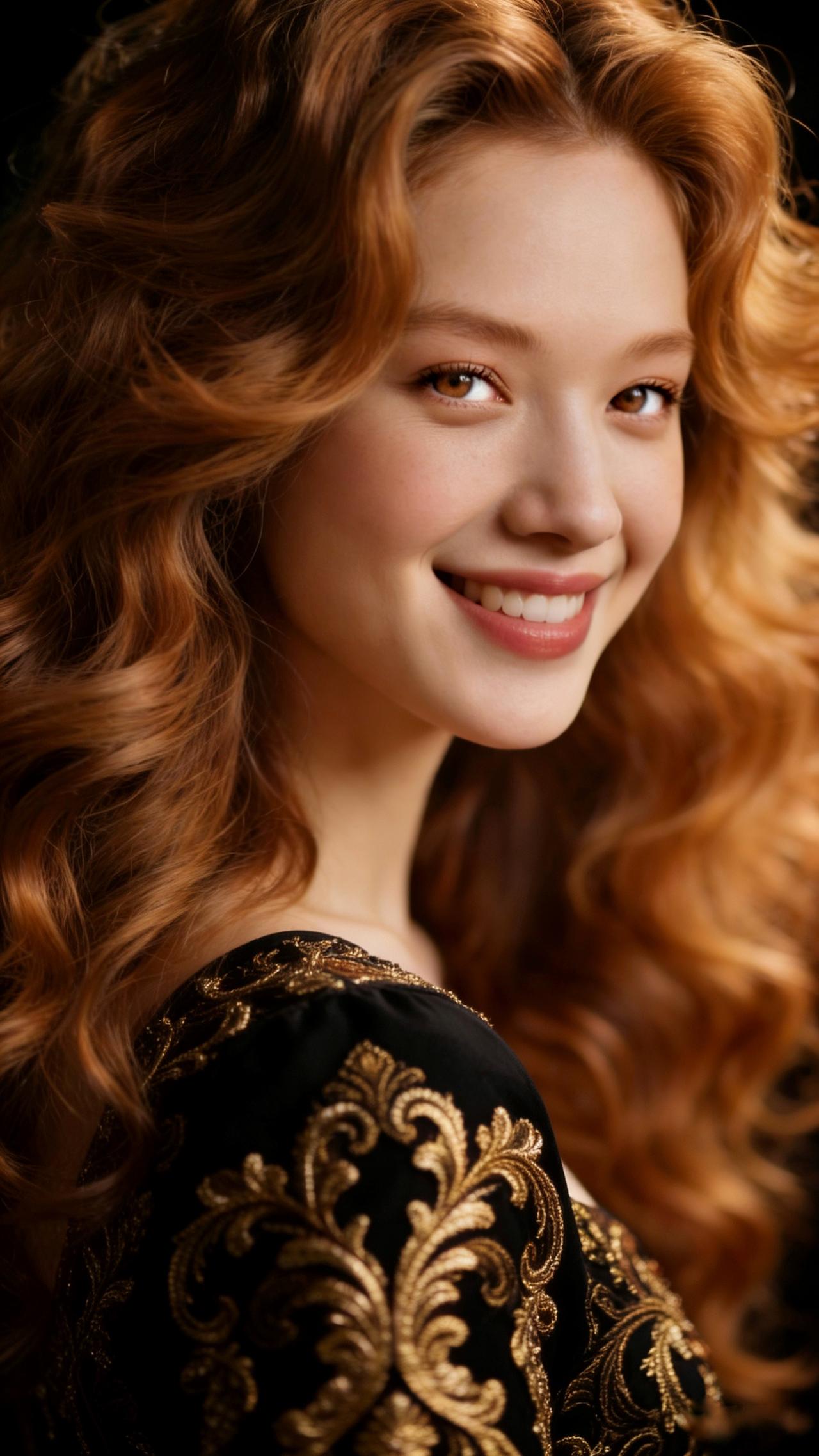 九帧同绘红棕卷发仙。发如焰卷流金光泽,黑衣金绣衬华贵,眉眼弯弯眸藏星,甜笑绽如春樱。纯黑背景衬仙姿,优雅贵气漫帧间,一眼心动! 图片为Al辅助完成,请注意甄别!