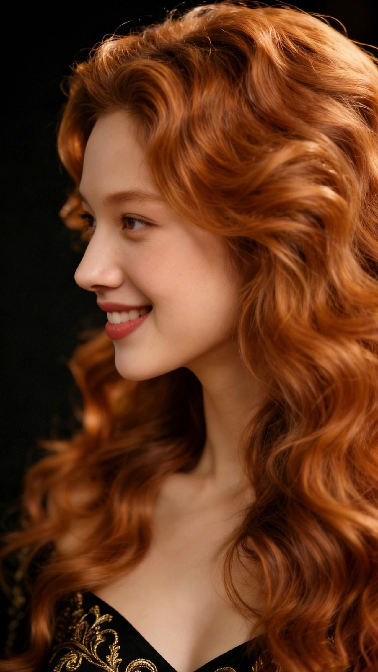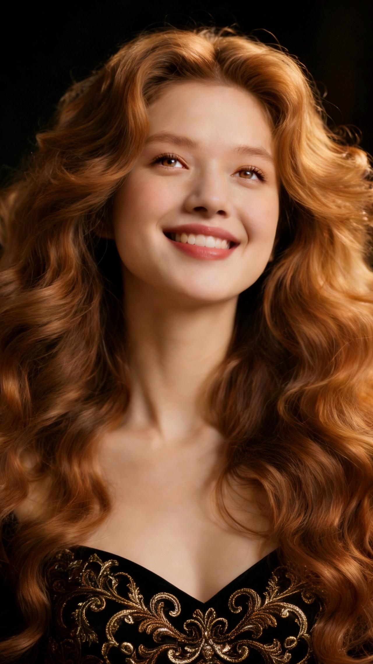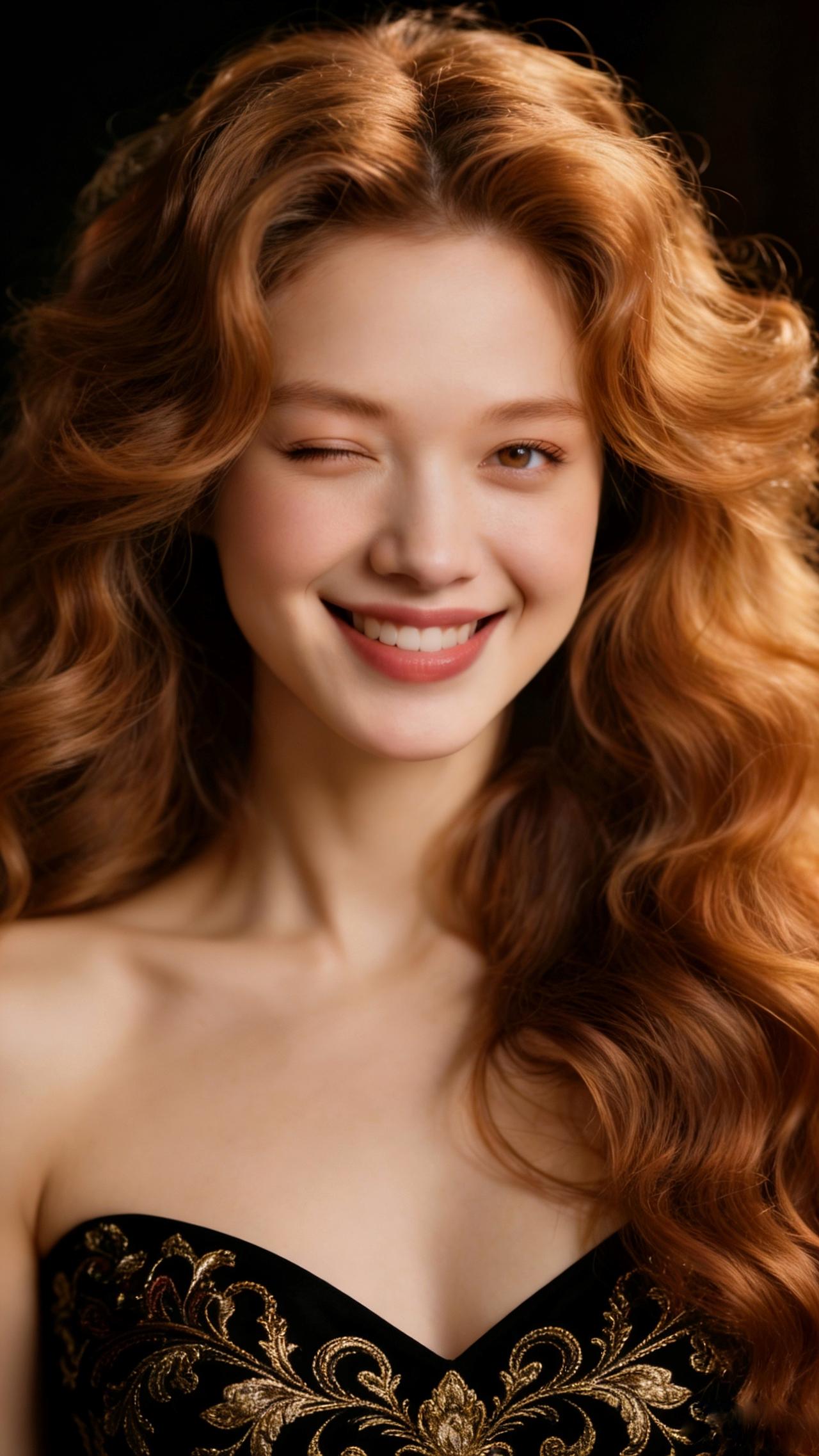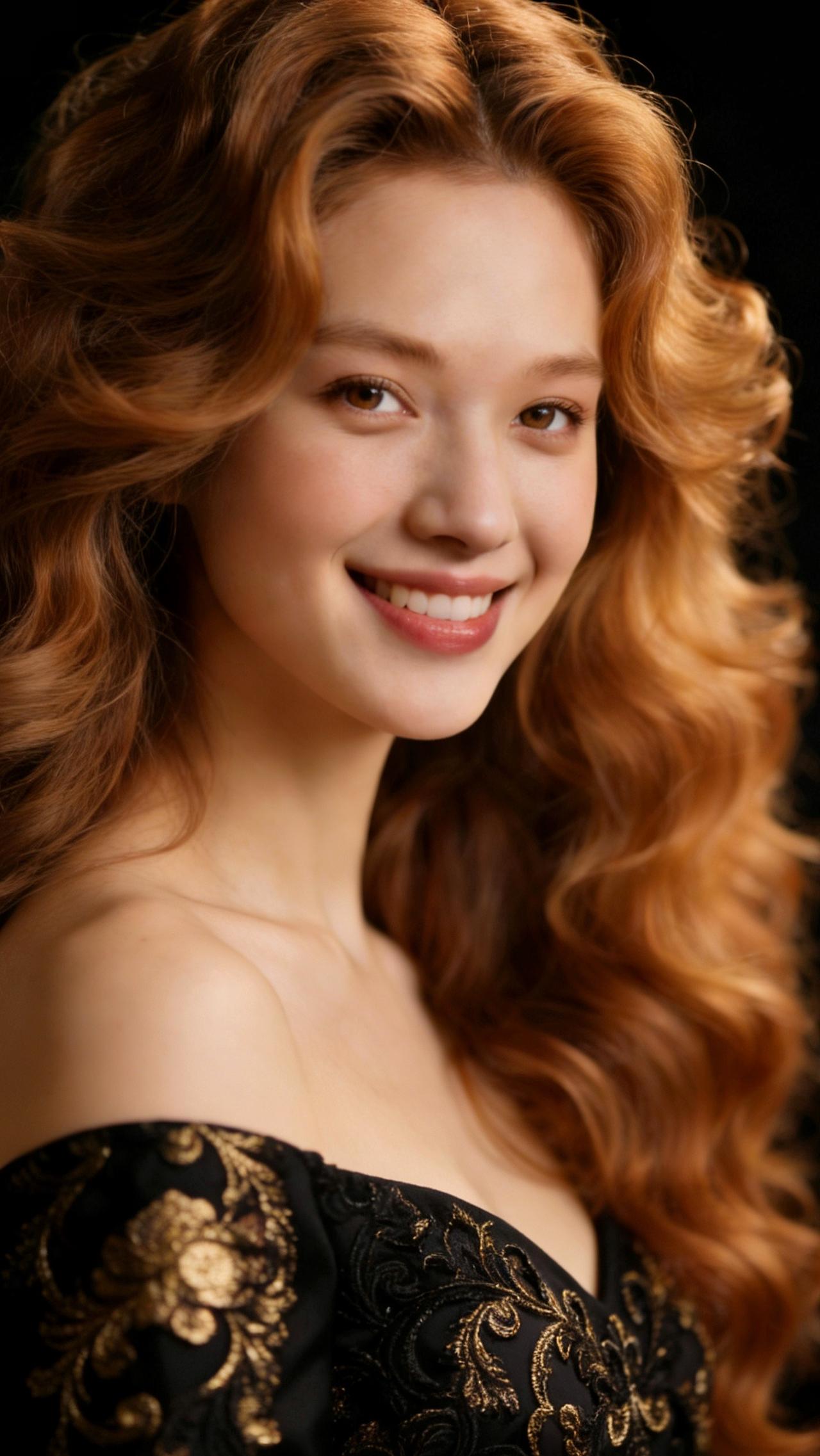 九帧同绘红棕卷发仙。发如焰卷流金光泽,黑衣金绣衬华贵,眉眼弯弯眸藏星,甜笑绽如春樱。纯黑背景衬仙姿,优雅贵气漫帧间,一眼心动! 图片为Al辅助完成,请注意甄别!