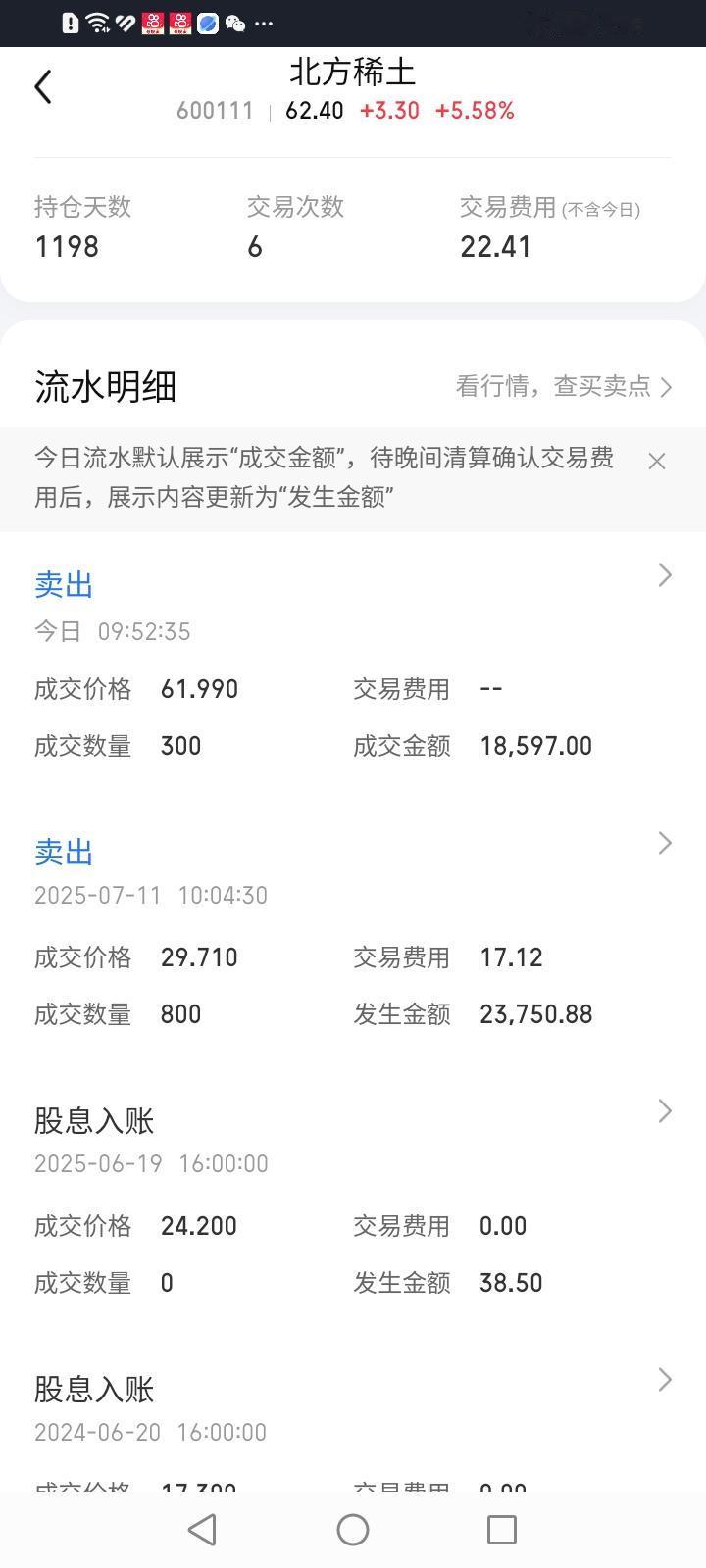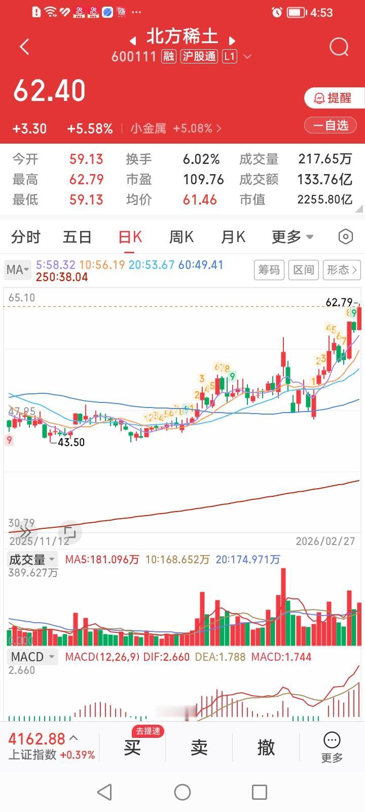 完犊子了,今天闹着玩挂了个卖出北方稀土的卖单,没想到还真成交了。 上午一开盘,北方稀土股价还在60.6元左右晃悠时,咱高挂了个61.99元的卖单,心想很可能成交不了,没想到只过了22分钟就成交了。 北方稀土这波强势拉升太丝滑了,从2月6号的最低价46.69元拉升到今天的最高价62.79元,短短十个交易日最大涨幅34.48%。而且其动态市盈率高达109.77倍。股价高估是确定无疑的。 涨时重势,看北方稀土这气势,这波涨势到底止于何时何处,谁能知道?但卖出持有了1198天的下金蛋的老母鸡真的有点可惜了。