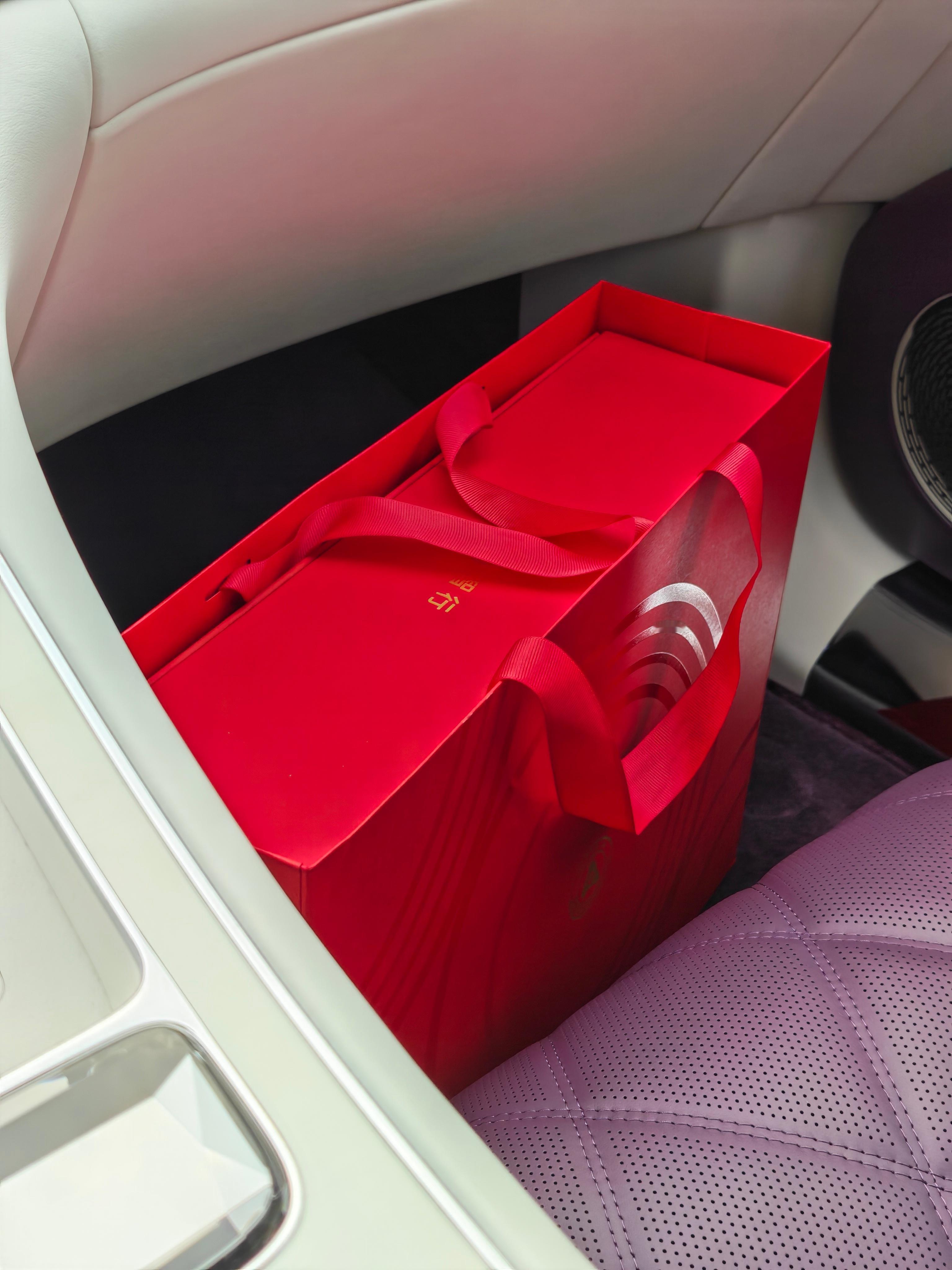 今天把尊界S800送去保养,回来发现车里又多了个礼盒,也没和我说啊,直接放在副驾了