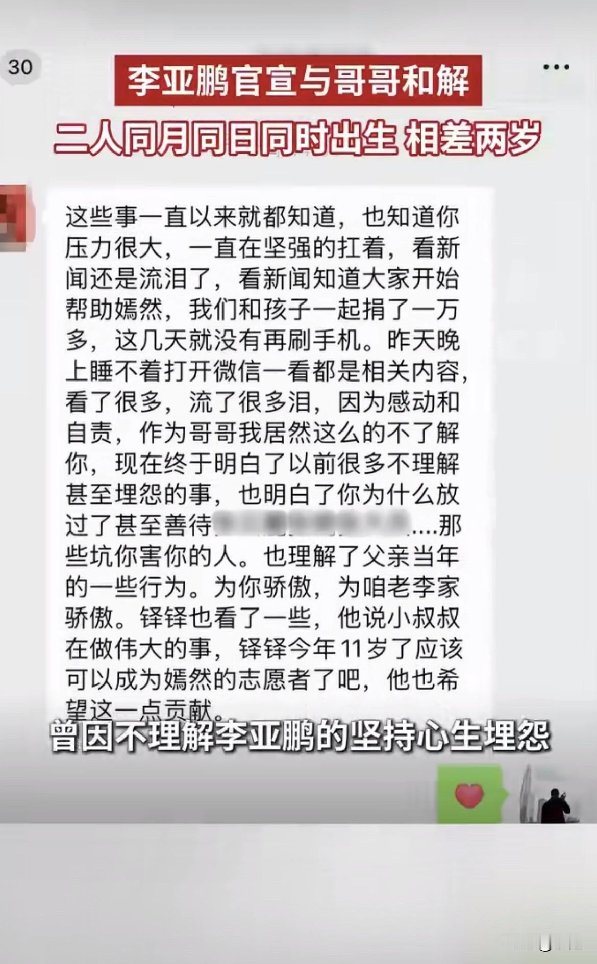 真的没想到,李亚鹏和他亲哥,断了18年的联系,最后是因为一条微信,和一万多块钱,就这么和好了。 这俩人是同月同日同时辰出生的,哥哥李亚炜大他两岁。从小吃一个生日蛋糕长大,中学时候哥哥天天罩着他,谁敢欺负李亚鹏,哥哥第一个冲上去 。 1999年父亲走了,哥哥在新疆开着大货车,直接把工作辞了,带着老妈跑到北京投奔弟弟。给李亚鹏当经纪人,管吃管住,李亚鹏成名前的生活费都是哥哥掏的 。 后来一起做生意,2008年投了丽江那个雪山艺术小镇,哥哥也入了点股,就0.35% 。结果项目砸了,欠了一屁股债。亲兄弟明算账,账算不清楚就闹掰了。 这一掰就是18年。哥哥结婚没告诉李亚鹏,生了儿子也没说。李亚鹏连自己亲侄子11岁了都不知道,更没见过 。 转机在今年1月23号。嫣然医院欠租2600万要关门的事上了新闻,34万网友在那捐款 。哥哥半夜睡不着刷手机,一条一条看那些普通人给弟弟的留言,看着看着就哭了。 他带着自己11岁的儿子也捐了一万多。然后给李亚鹏发了条微信:作为哥哥居然这么不了解你,看新闻才知道你这些年扛着多大的压力。现在才明白,你为什么能放过那些坑你的人。 最戳人的是那句:我儿子说小叔叔在做伟大的事,他要当嫣然志愿者。 李亚鹏说看到这条信息瞬间泪目,一座18年的冰山就这么化了。 仔细想想,哥哥当年给弟弟当经纪人,后来做生意赔了,心里可能一直有个疙瘩:我为了你从新疆跑到北京,最后落得这个下场?结果16年来弟弟闷头做慈善,医院快关了也没公开叫苦,自己硬扛着。哥哥这才看懂,弟弟不是在瞎折腾,是真的在帮那些兔唇孩子。 那个11岁的侄子更有意思,都没见过这个叔叔,反而通过新闻知道叔叔在做的事,主动要当志愿者。有时候孩子的眼睛真的比大人干净。 人和人之间有些结,说到底是钱的事,又不仅仅是钱的事。时间长了,你还在做那件对的事,总会有人看懂。 55岁的李亚鹏,等来了哥哥一句“为你骄傲,为咱老李家骄傲” 。 你们觉得,兄弟之间因为钱闹翻了,还有可能和好吗?