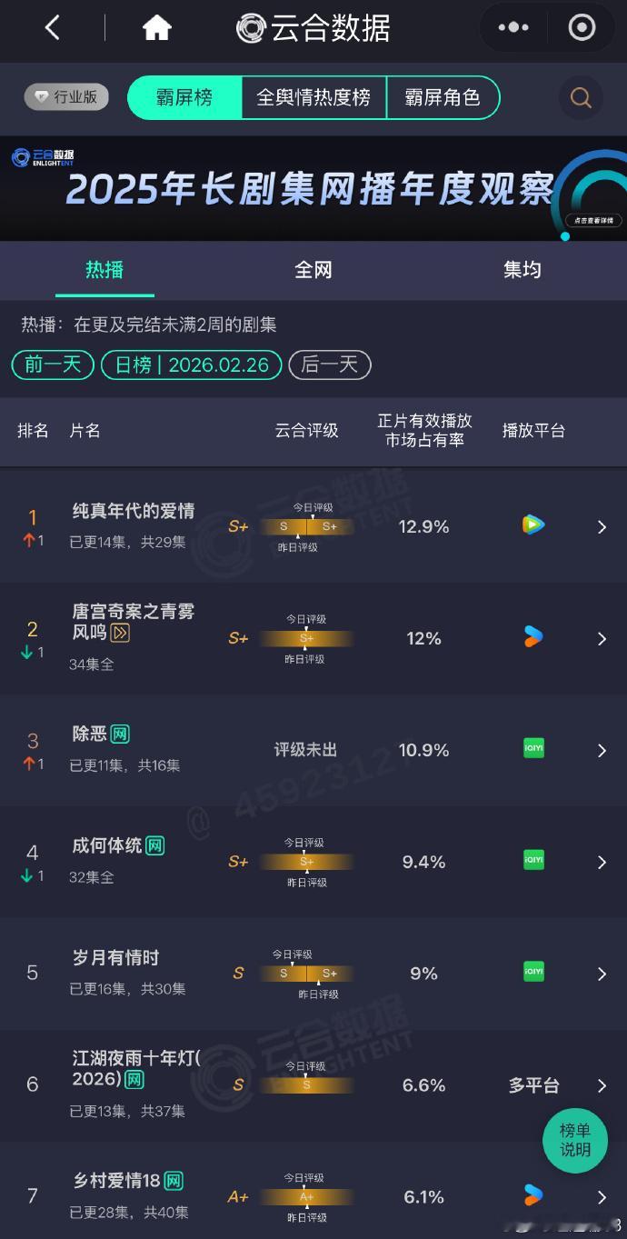 陈飞宇新剧云合双榜登顶 实力说话!陈飞宇新剧直接登顶云合双榜,从开播到现在热度只增不减,好作品好演员,真的越看越上瘾!