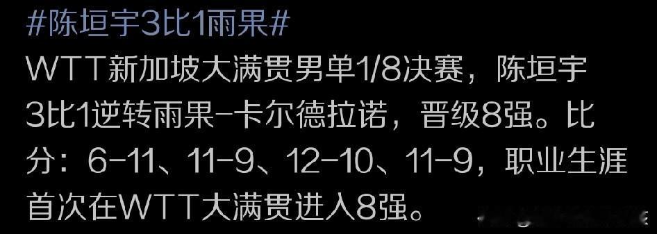 新加坡大满贯赛的赛场上进入男单1/8决赛的争夺,可以说剩下来的高手要么是世界知名球员,要么就是一些具有非常大的潜力的年轻新星。总之,每一场16进8争夺战,其实都称得上是顶级高手之间的交锋。 结果国乒不满20周岁的小将陈垣宇,面对一度拿到过世界杯单打冠军的巴西名将雨果卡尔德拉诺,并没有被对方的名气和在世界大赛上的经验和过往战绩所吓倒,而是在对对手的打法不是十分了解,而对方对自己也不是特别熟悉的情况下,通过第一局的适应,逐步找到限制对手的方法,尽管一上来6:11先丢一局,但是在接下来的三局比拼当中,每局都是和对方比分紧咬,而且进攻能力还有防守韧性方面也是展现的淋漓尽致。特别是在和对方始终能打到关键分的情况下,陈垣宇对困难的准备还是比较充足,几次在双方战成平局的情况下,还是依靠关键分能力赢得后三局的比赛胜利,而且每一局都是险胜。双方二三四局的具体比分是11:9、12:10和11:9。 这样,陈垣宇就在四局之内以3:1的总比分淘汰雨果卡尔德拉诺这种世界排名前五的球员直接锁定一个男单8强的席位,而这也是陈垣宇作为国乒年轻的潜力派小将,职业生涯当中第一次闯进大满贯赛的男单8强。 值得一提的是国乒的几位小将近期都在不同的比赛当中获得出场机会,可以和世界顶级高手过招,尽管这里面有胜有负,但是从这种比赛当中所积累的经验教训都是年轻球员们的一笔财富。也为他们在更强大的对手面前,展现出自我竞争力,并拿到比赛胜利,创造了更好的条件。前一阶段的温瑞博如此,现在的陈垣宇也是如此。 这一次,显然卡尔德拉诺的世界排名稍微有点儿虚高的问题再一次暴露出来,他的综合进攻能力稍稍偏弱的问题也在这场比赛当中显现的比较明显。陈垣宇是把比赛控制在自己的节奏当中,依靠个人技术能力,还有顽强的作风,加上面对世界顶级高手,完全释放自我的那种拼劲儿,赢得了比赛最后胜利。 尽管在后面的比拼当中,陈垣宇不一定能走到最后,但是至少现在能锁定一个男单八强名额对他来说已经是一种成功。而且能把世界杯单打冠军给淘汰出局,也会对陈垣宇在这种关键比赛当中的信心提升有很大的帮助作用。水又敢说它一定走不到最后呢? 让我们选择相信陈垣宇会在后面的比拼当中有更出色的发挥,也需要我们继续关注一下,他是否能在未来的竞争当中利用这种起势的机会,全力争取一个国乒五大主力的正式名额,毕竟周启豪、梁靖崑等老将已经开始进入职业生涯末期,也到了陈垣宇他们这些小将利用在世界赛场上的闪光开始出成绩并抢班夺权的时候了,您觉得呢?