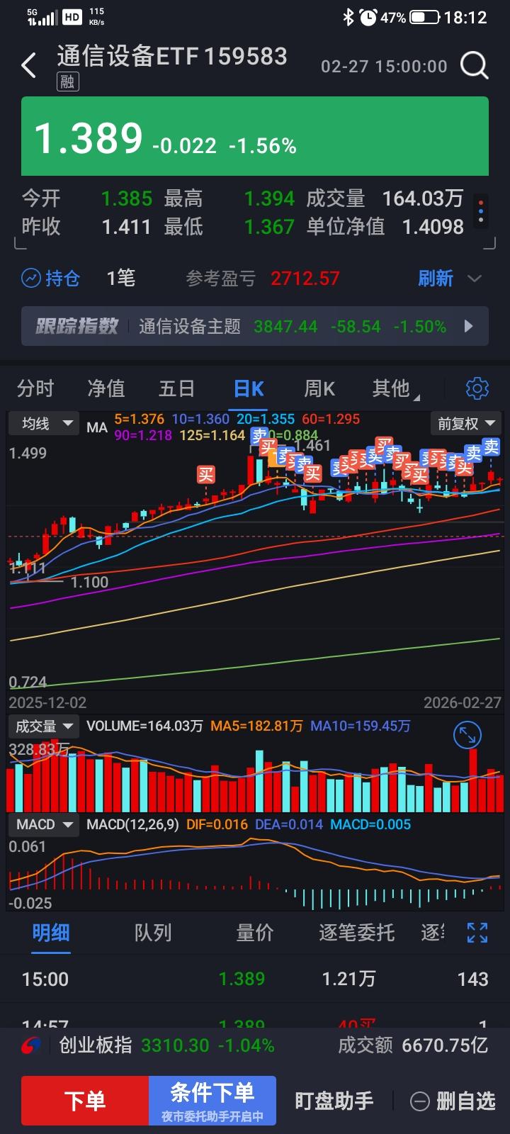 2月结束了,统计了一下,这个月通信设备etf网格交易,一共买入了21700股,买入均价1.338元,卖出了22000股,卖出均价1.378元,卖了与买入差价0.04元,网格交易差价赚到868元,上个月底价格是1.379元,这个月底价格是1.389,上涨了1分钱,如果只是持有不动就是终点又回到起点,微涨一点点,网格交易做t,还是比持股不动好,赚到868元,降低了持有的成本,风险更低一点。忽略价格的涨跌,赚取波动的差价,虽然赚点少,但是还是更省心,涨跌不惊。