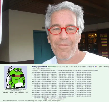 #美媒爆爱泼斯坦死讯提前被公布#【猛料:“爱泼斯坦死讯提前被公布”】#爱泼斯坦案再爆猛料# 据美国“商业内幕”网站26日报道,美国司法部公开的相关文件显示,在美国富商杰弗里·爱泼斯坦死于狱中的消息被媒体报道前,一名用户就在美国论坛网站4chan公布了他的死讯,美国联邦调查局(FBI)试图查明发帖者身份,但最终未能确认。