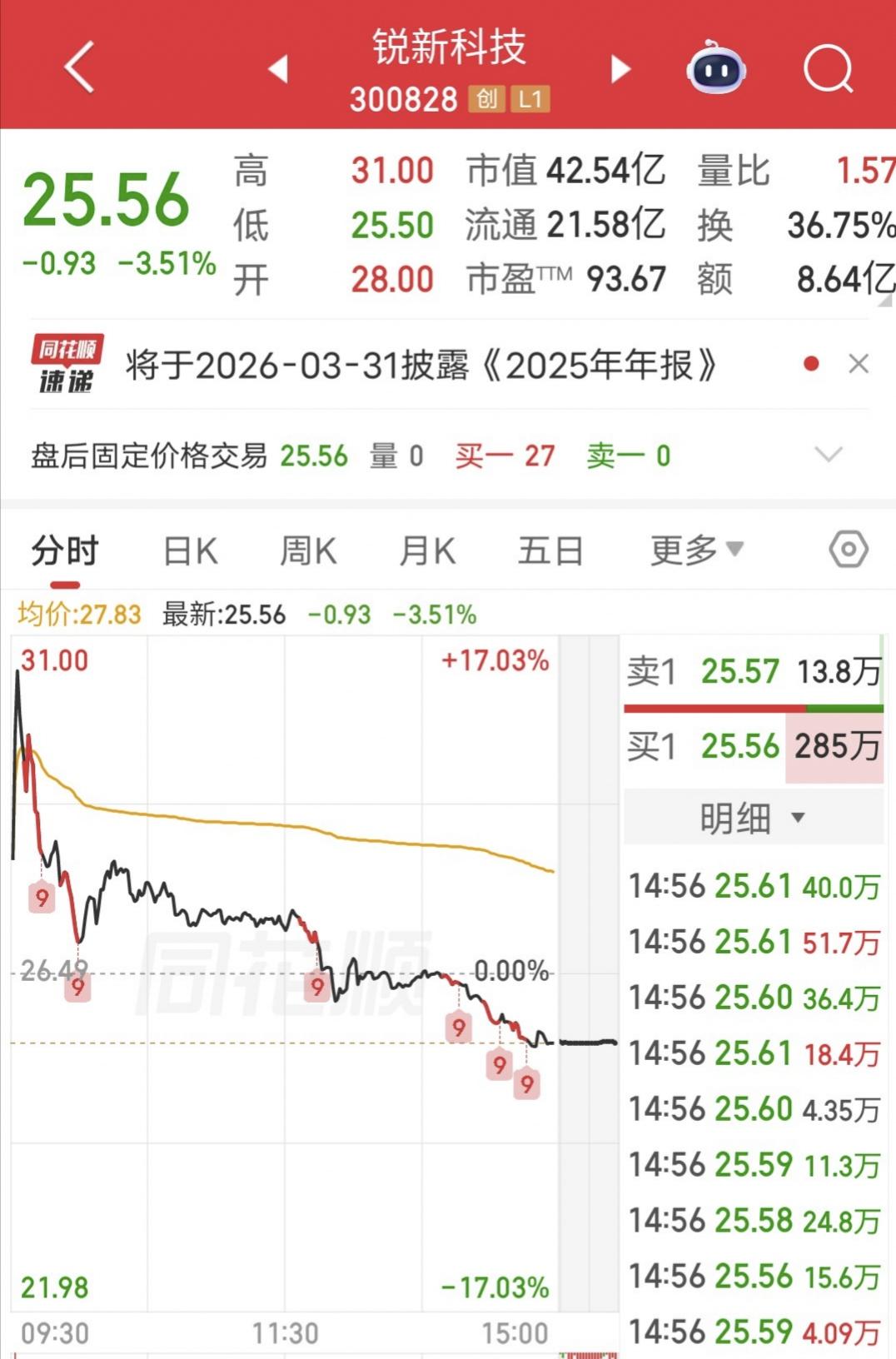1天20个点大面! 今天盘面上最大的一碗面来自锐新科技。 该股高开后直线上冲到17个点,结果随后一路跳水,接近最低点收盘。 如果早上最高买的话,最多被套近20个点,要亏麻了。