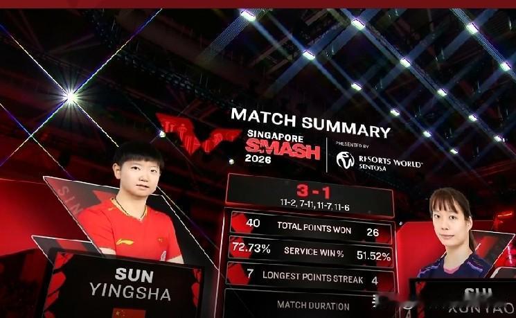 WTT,新加坡大满贯赛的赛场上,在莫雷加德3:1。战胜博雷特拼下一个男单八强席位,并将在8进4争夺战当中和国乒年轻小将,淘汰了雨果卡尔德拉诺的陈垣宇迎来正面交锋之后,两位国乒球员之间的内战也是接续上演。交锋的双方是现世界排名第一的孙颖莎,和近期在世界赛场上稳定性有所提升,把稳定在世界前十左右的石洵瑶。 由于孙颖莎在整体实力上要明显优于石洵瑶。但是两位队友之间又互相非常了解,同时石洵瑶在打法上也有一些自己的特点,并具备一定的竞争力,所以比赛即使更容易让我们猜出孙颖莎会成为胜出者,但石洵瑶同样在比赛当中给孙颖莎带来很大的竞争压力,并给她制造了足够多的困难,这对于孙颖莎继续争取在后面的比拼当中有更出色的发挥也有一定的促进作用。 果然,比赛首局孙颖莎进入状态比较快,即使一上来先让石洵瑶拿到一分,不过她后面直接打出7:1的小高潮,就是通过各种发接发还有前三板的战术变化,不断把石洵瑶给打乱节奏。这种来回球让孙颖莎在场上显得游刃有余。随着石洵瑶出现回球下网,10:2,孙颖莎是轻松赢得第一局的局点。随着她前三板上手后的直线进攻再度转化成得分,11:2,孙颖莎也相对轻松的赢下双方第一局,占据大比分上的1:0领先。 不过第二局的交锋当中,显然石洵瑶在首局大比分失利之后稍稍做了一些战术调整,而孙颖莎的反手进攻则在前半局当中失误偏多,这让石洵瑶一上来就打出了一个4:0的小高潮,并在后面保持4:1,7:2的领先优势,即使后面孙颖莎通过自己的控制力,还有节奏变化,4:7,6:9,7:10迫近分差,不过石洵瑶在比分占优的情况下,还是依靠中路对攻当中孙颖莎的回球下网,11:7扳回一成,双方大比分战成1:1平。 比赛来到第三局的争夺,开局双方迅速战成3:3的平局,后面孙颖莎则用自己的线路控制和节奏控制实现8:4的比分领先。但在孙颖莎拿到9:5的领先优势之后,石洵瑶也是通过一个漂亮的削球进攻造成孙颖莎回球下网,7:9和8:9迫近比分,但孙颖莎在局面稍显困难的情况下并没有叫暂停,还是通过自己场上的心态调整,逐步稳住心神,依靠一个失位情况下的极限斜线出手,11:7又赢下双方第三局,占据大比分上的2:1领先。 比赛的第四局,孙颖莎已经火力全开,而且心态和技术状态也都来到了一个新的高度,这让她在第四局一上来就拿到了4:1的开局比分领先,石洵瑶也在这个时候叫了暂停。不过暂停回来孙颖莎继续扩大领先优势来到5:1,而且在后面还依靠一个擦边球得分,继续保持6:3的领先优势,并通过一个中路大力进攻,造成石洵瑶回球下网,重新拿到7:3的四分领先优势。局末阶段孙颖莎也是连续得分,10:3迎来赛点。尽管石洵瑶打得非常投入和坚定,连续得分的同时6:10迫近比分,但随着孙颖莎中路连续进攻造成石洵瑶回球下网,11:6孙颖莎又赢下双方的第四局比拼,就此实现了3:1的胜出晋级,锁定了一个女单8强的席位,让我们恭喜孙颖莎,也把掌声送给拼出不错的进攻效率并在场上展现一定竞争力的石洵瑶。双方四局具体比分是11:2,7:11、11:7和11:6。