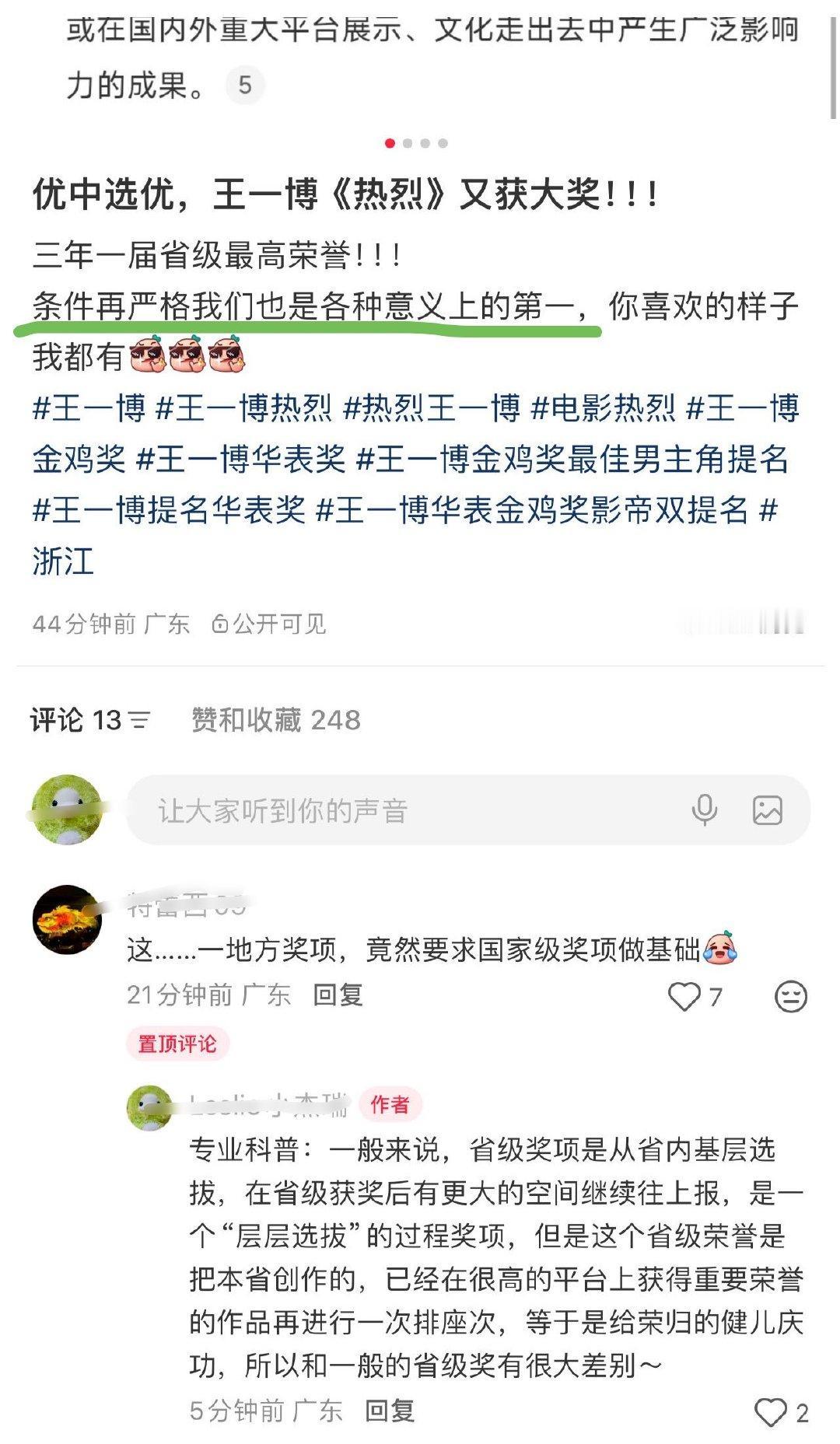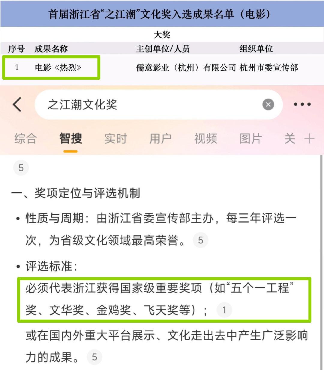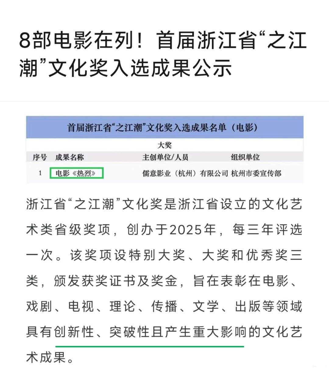 电影《热烈》荣获首届浙江省“之江潮”文化奖大奖🏆,名列榜单第一名🥇!标杆电影就是牛。🎉 这个省级奖项可是要求国级重要奖项作为基础的,门槛高。相当于给获了国奖的优秀作品再次排序、庆功,三年一次优中选优![赞] 要问评选标准是怎样的,请看《热烈》,《热烈》就是这个奖项的评选标准的全面体现: 1. 【国奖】:“五个一”工程奖获奖、金鸡+华表最佳故事片双提名、王一博金鸡+华表影帝双提名。 2. 【创新性、突破性】:国内体育片票冠,全球街舞题材代表性影片,杭州亚运会街舞宣传影片。 3. 【在国内外重大平台展示,在文化走出去中产生广泛影响】:《热烈》三十多次在各国电影节上作为中国代表性影片展映,是中国电影的外交名片,文化输出的重要影片!