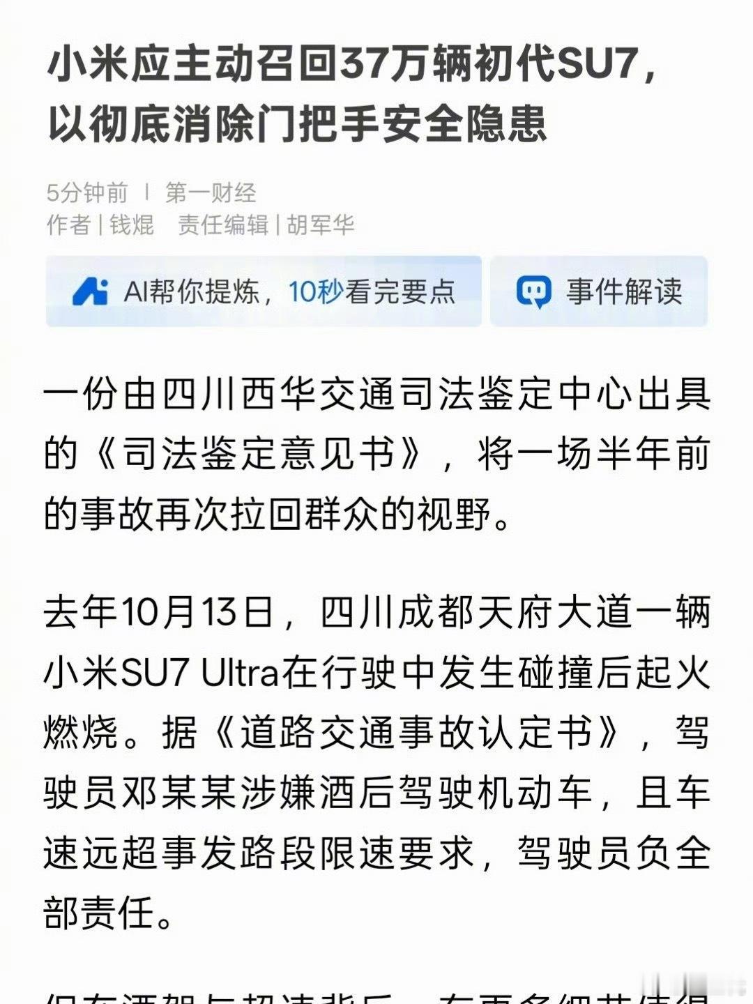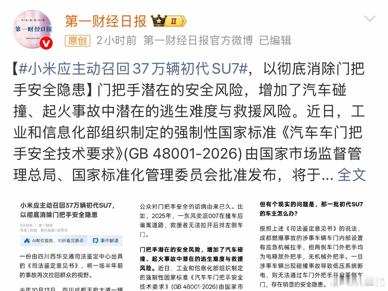 第一财经总是盯着小米,关于汽车门把手的国标已经出了,各大车企之后肯定会遵守。隐藏式门把手确实没有最简单的门把手好用