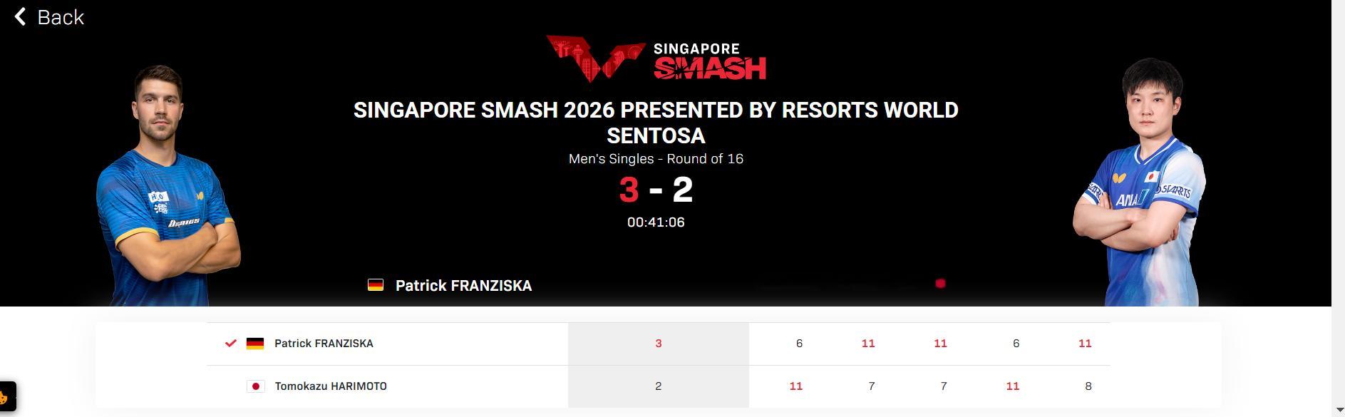弗朗西斯卡迎来对张本智和首次胜利 之前弗朗西斯卡与张本智和有过9次交手,无一胜绩刚结束的新加坡大满贯,3-2战胜张本智和,迎来首次胜利