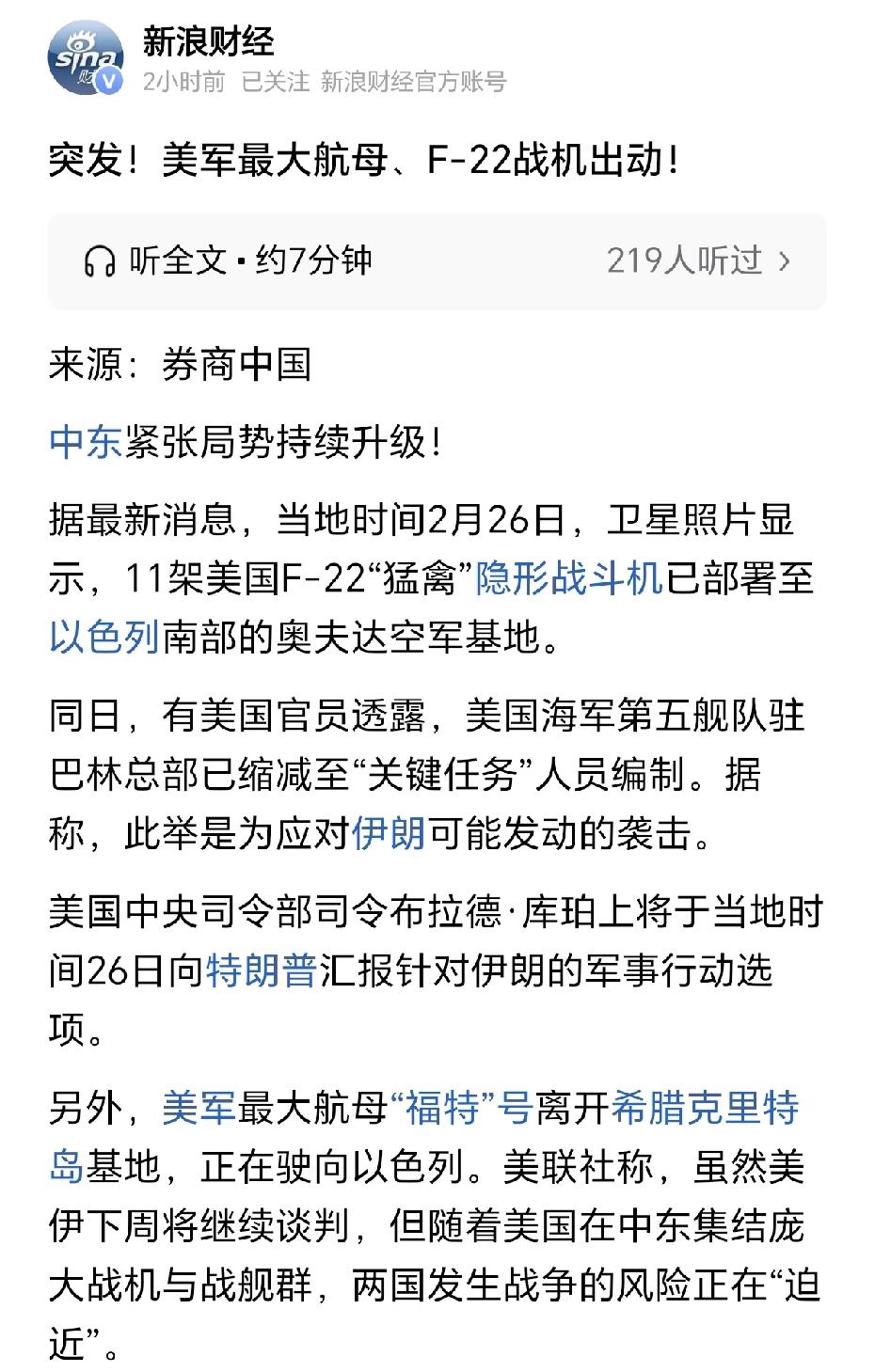 3条新闻,条条劲爆。特别是最后一条。 1.美国20架加油机飞抵以色列。 2.美国最大航母,F22战斗机出动。 3.外交部提醒中国公民暂勿前往伊朗。 最后一条最致命,现在国际社会基本上都把中国撤侨作为一场战争的信号。 如果中国队已经开始撤侨了,那基本上这场仗就免不了了。 看来近期伊朗战争,已经在所难免,迫在眉睫了。